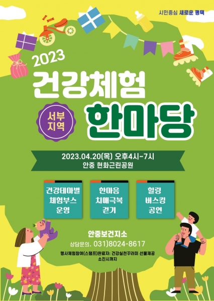 [금요저널] 평택시 안중보건지소는 서부지역 시민을 대상으로 4월 20일 오후 4시부터 7시까지 안중읍 현화근린공원에서 건강체험 한마당 행사를 운영할 예정이다.