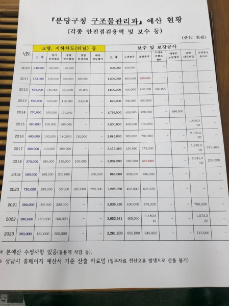민주당협의회는 2010년부터 2022년 분당구청 구조물관리과 교량유지보수예산을 전면공개하고 국민의힘이 2018년도 예산만 지적하며 마치 40%의 교량유지보수예산을 줄어서 이번 정자교 붕괴의 원인처럼 국민들을 호도하는 행위는 가장 저질의 정치공작이라고 전했다.
