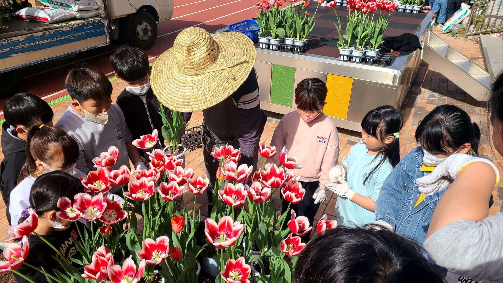 4월 12일 첫 수업은 3학년, 4학년이 학교 정원의 일부를 다년생 구근류인 튤립과 루피너스, 피나타를 심어 빨간색, 보라색, 분홍색 등으로 정원을 만들었다.