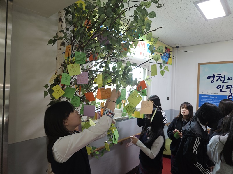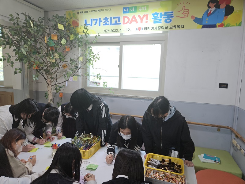 □ 영천여자중학교(교장 김경숙)는 나 너 우리 니가 최고 DAY!를 4월 12일 수요일 점심시간을 이용하여 학생들 간의 친구 관계 증진 및 칭찬문화 만들기를 위한 칭찬 릴레이를 하였다. 칭찬 릴레이는 4월을 시작으로 12월까지 운영하는 연중행사로 매월 둘째주(칭찬 주간) 실시한다.