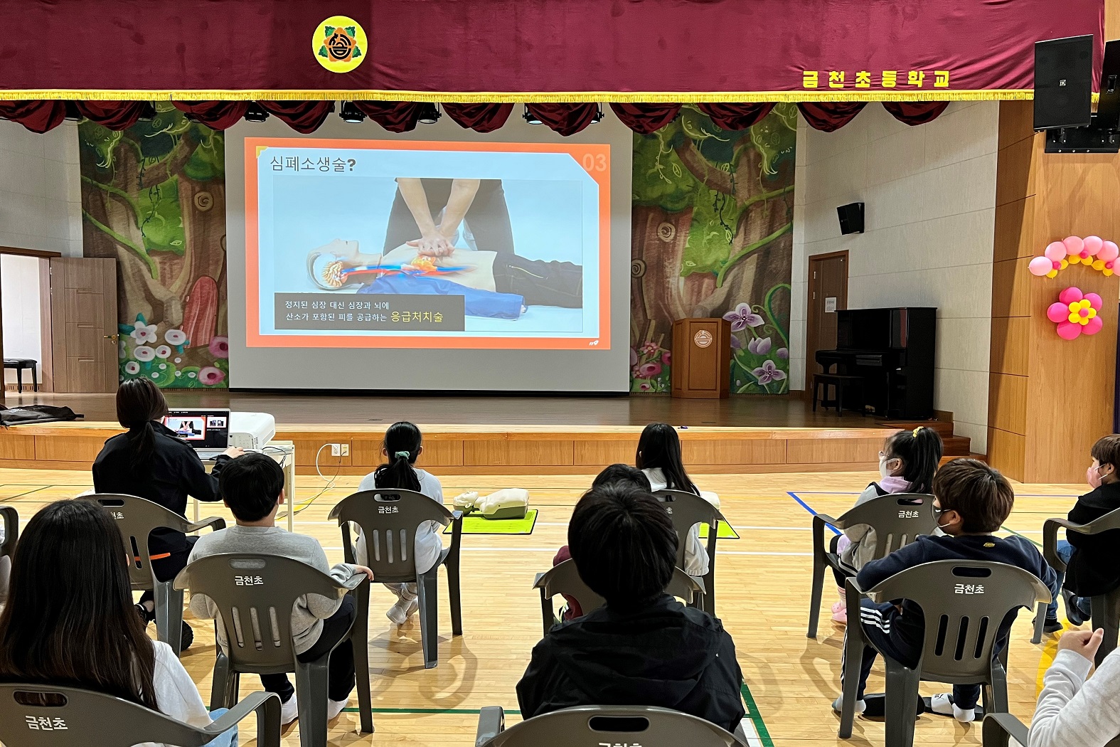 금천초등학교(교장 최성욱)는 4월 13일(목), 시청각실에서 2차시에 걸쳐 4~6학년 학생 25명을 대상으로 심폐소생술 교육 등 응급처치 교육을 실시하였다.