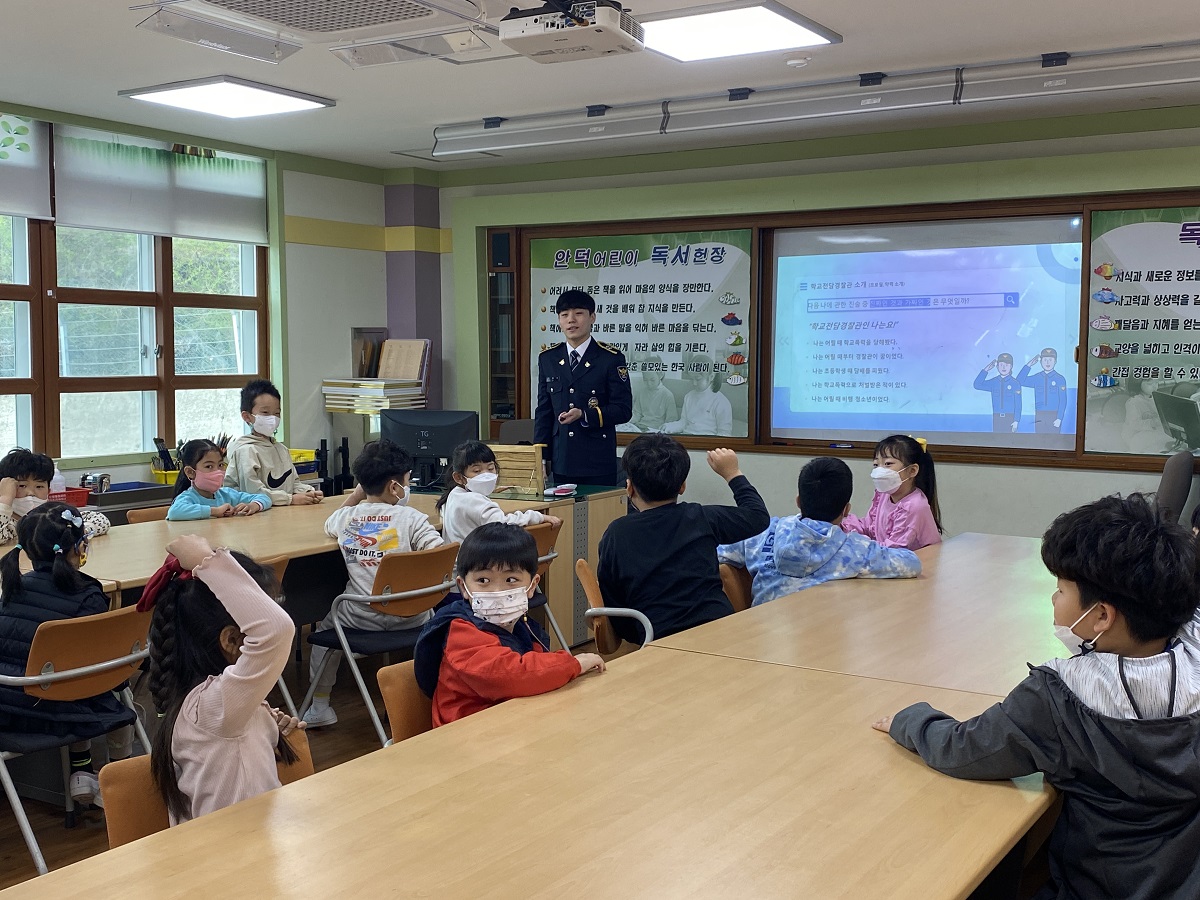 □ 안덕초등학교(교장 오정선)는 4월 14일(금)에 초등학교 학생들을 대상으로 학교전담경찰관이 학교를 방문하여‘학교폭력전담경찰관교육’을 도서관에서 실시하였다. 이번 교육은 학생들의 학교폭력에 대한 올바른 의식과 대응 역량을 길러주며 적극적 예방자로 육성하여 학교폭력문제를 자율적으로 해결하는 능력을 기르고자 실시하였다.