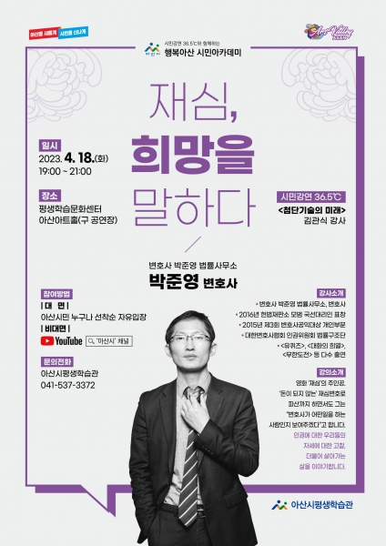한편 아산시민 누구나 행복아산 시민아카데미에 참석해 강연을 들을 수 있으며 강연은 YouTube로도 실시간 송출된다.