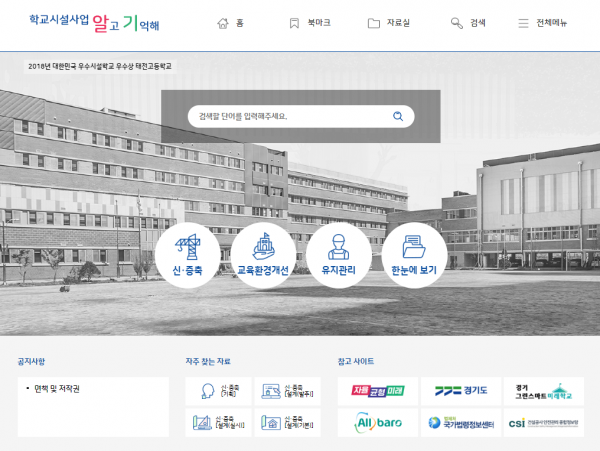 홈페이지 형태로 제작된 업무매뉴얼 ‘학교시설사업 알고 기억해’는 그간 책자, 파일 등으로 제공하던 업무매뉴얼 대신 언제 어디서나 편리한 스마트기기 활용으로 사용자의 접근성과 활용성을 높인 것이다.