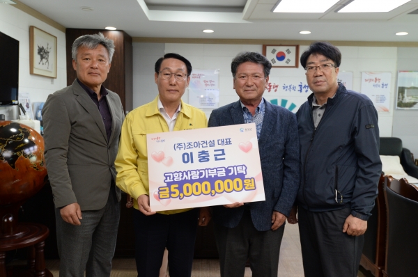 홍성군은 ㈜조아건설 이충근 대표가 지난 11일 홍성군을 직접 방문해 이용록 홍성군수와 기부금 기탁식을 갖고 홍성군 고향사랑기부제에 응원을 전했다고 밝혔다.