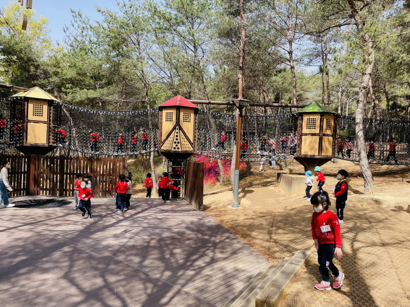 □ 범우리 공원에서 자연물 놀이 이외에도 짚와이어, 터널 놀이, 파고라, 오르기 놀이시설, 스카이워크 조합놀이대, 그물 건너기, 삼각 그물, 원형 그네, 기둥 건너기 등 숲속 놀이터에서의 신체놀이가 다양하게 이루어졌다.