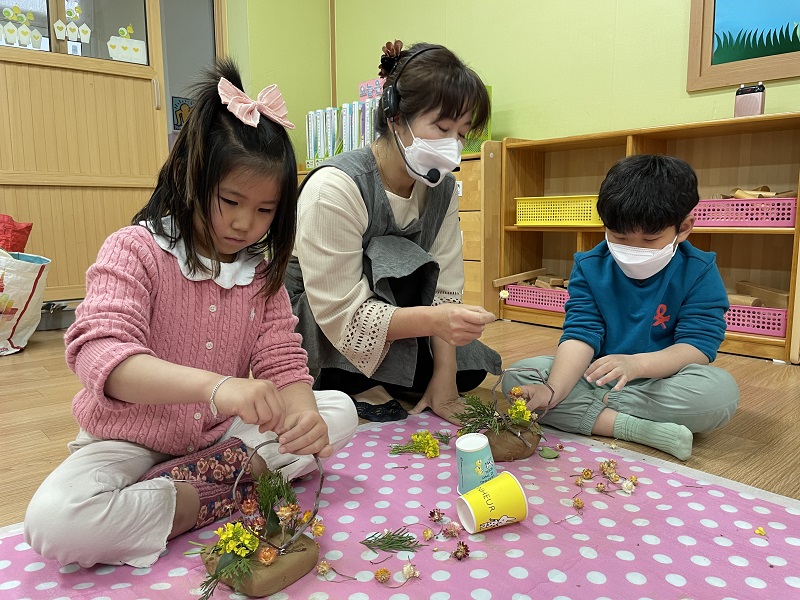□ 도예가 이루리정원 대표는 유치원을 찾아와서 유치원 원아들에게 흙과 자연물을 이용한 다양한 예술작품에 대한 다양한 이야기를 들려주고, 흙과 자연물을 활용한 토우만들기, 나도 플로리스트, 발 촉감놀이 등 다양한 흙놀이 활동을 전개하였다.