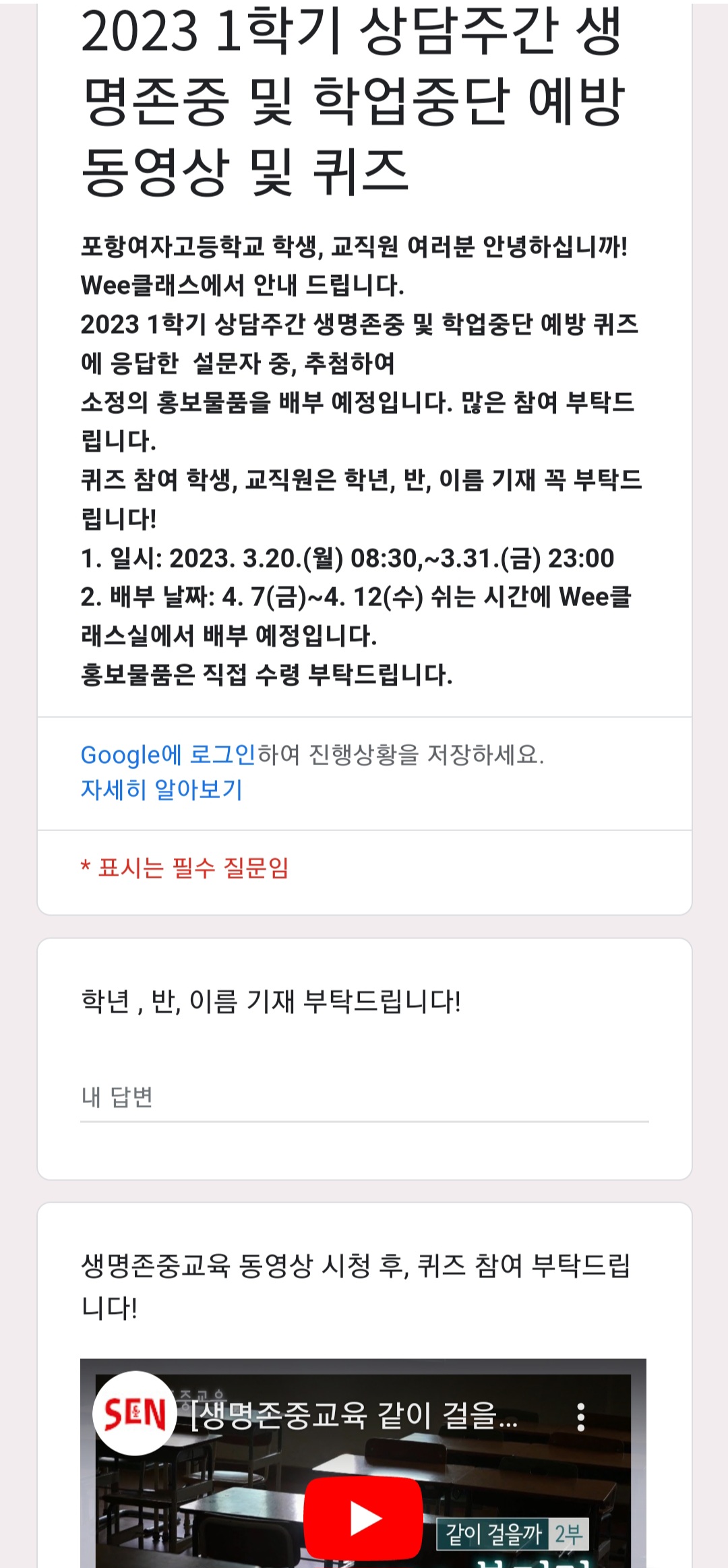 ▢ 포항여자고등학교(교장 민형규)는 3월 27일(월)~4월 14일(금)까지 생명 존중 및 학교생활 적응력 향상, 학교폭력 예방을 위해 학생, 학부모를 대상으로 2023 1학기 상담주간 및 친구야 사랑한데이 생명 사랑 주간을 운영 및 다양한 행사를 진행했다.