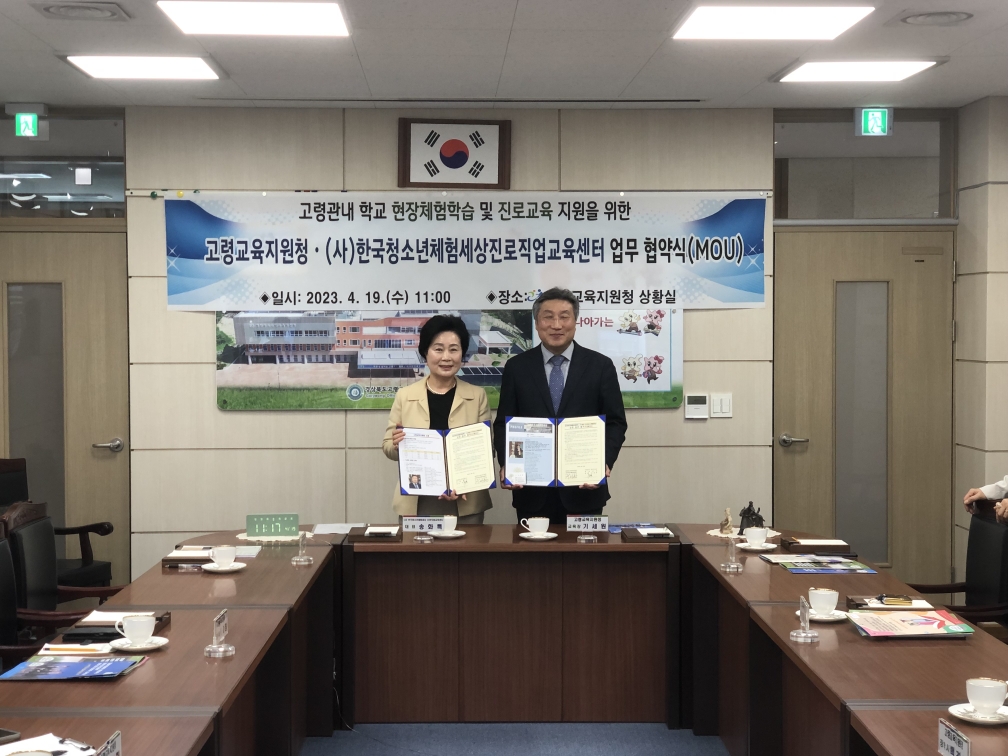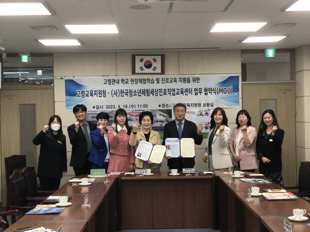 경상북도고령교육지원청(교육장 기세원)은 4월 19일(수)에 고령교육지원청 상황실에서 사단법인 한국청소년체험세상 진로직업교육센터 대표와 관계자가 참석한 가운데 업무협약(MOU)을 체결하였다.