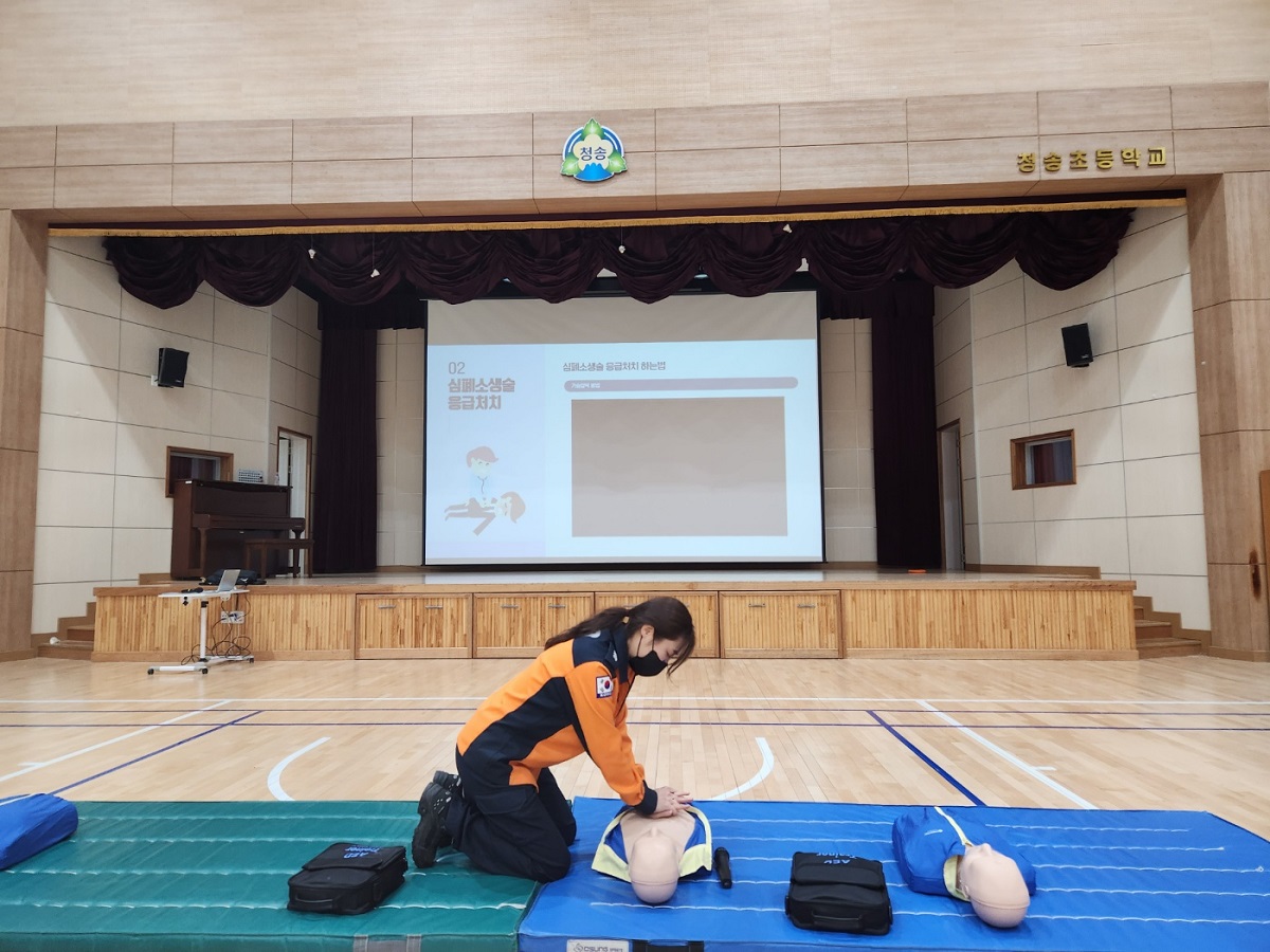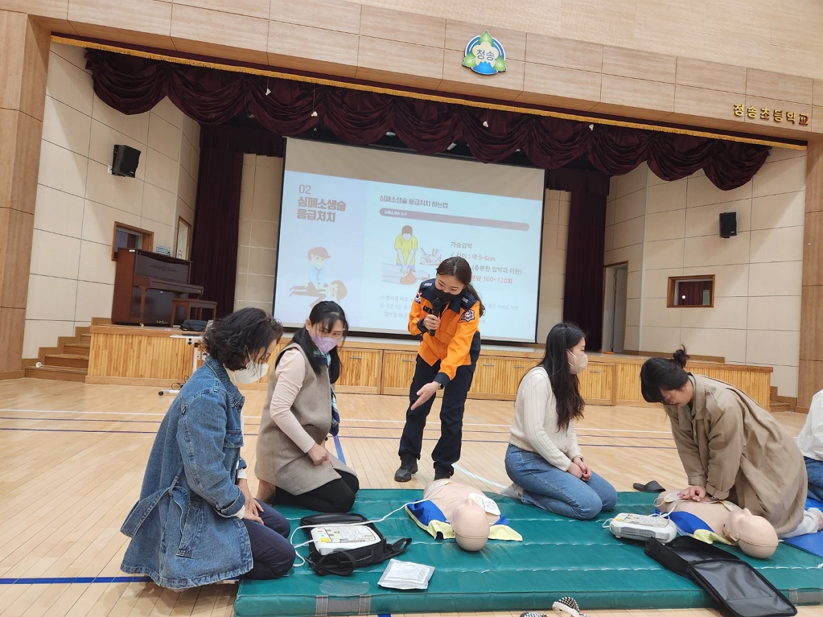 - 청송초등학교(교장 남정일)는 2023년 4월 12일 수요일 본교 강당에서청송초 교직원을 대상으로 심폐소생술 등 응급처치 연수을 시행하였다.