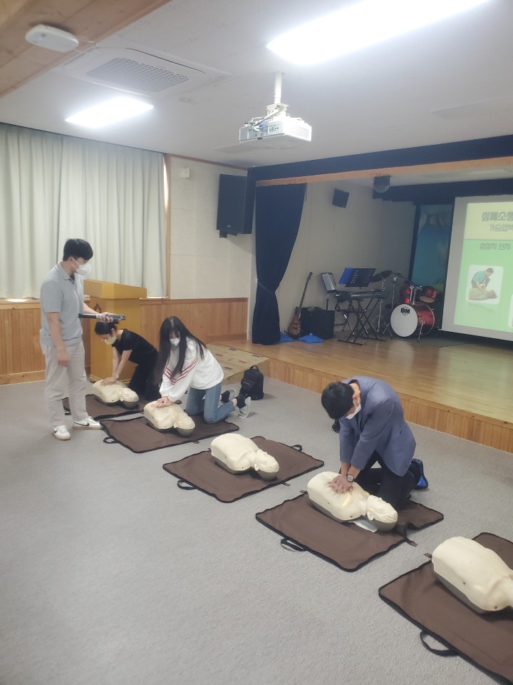 □심폐소생술은 소중한 가족과 이웃을 지키기 위해 필수적으로 익혀야 하는 응급처치법이라는데 인식을 같이하고 특히 5월 말에 전교생이 제주도 수학여행이 예정되어 있는 만큼 만일의 사태가 일어날 경우를 대비하기 위해 심폐 소생술 및 자동제세동기 사용법 연수에 전 교직원이 적극적으로 참여하고 진지한 교육 실습이 이루어졌다.