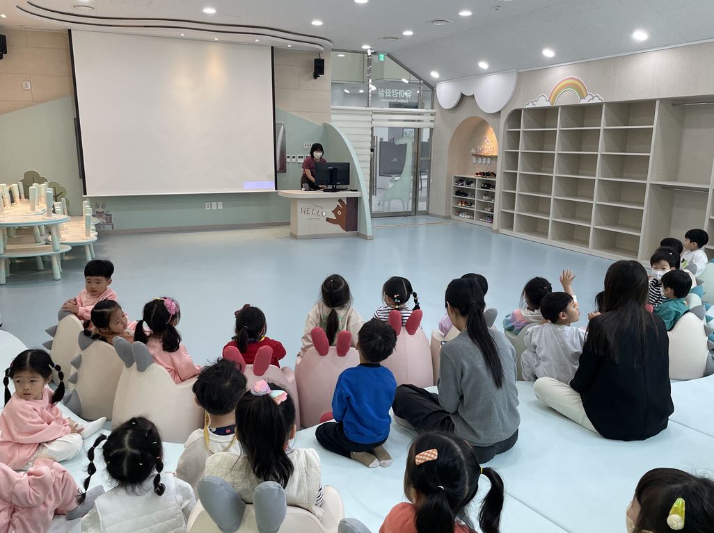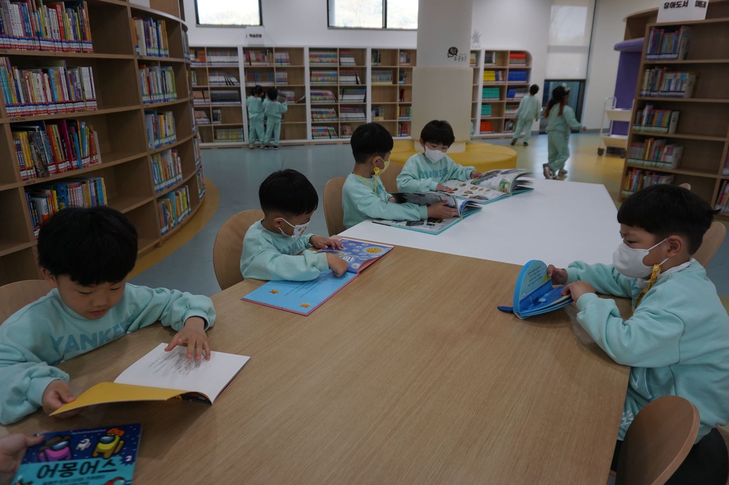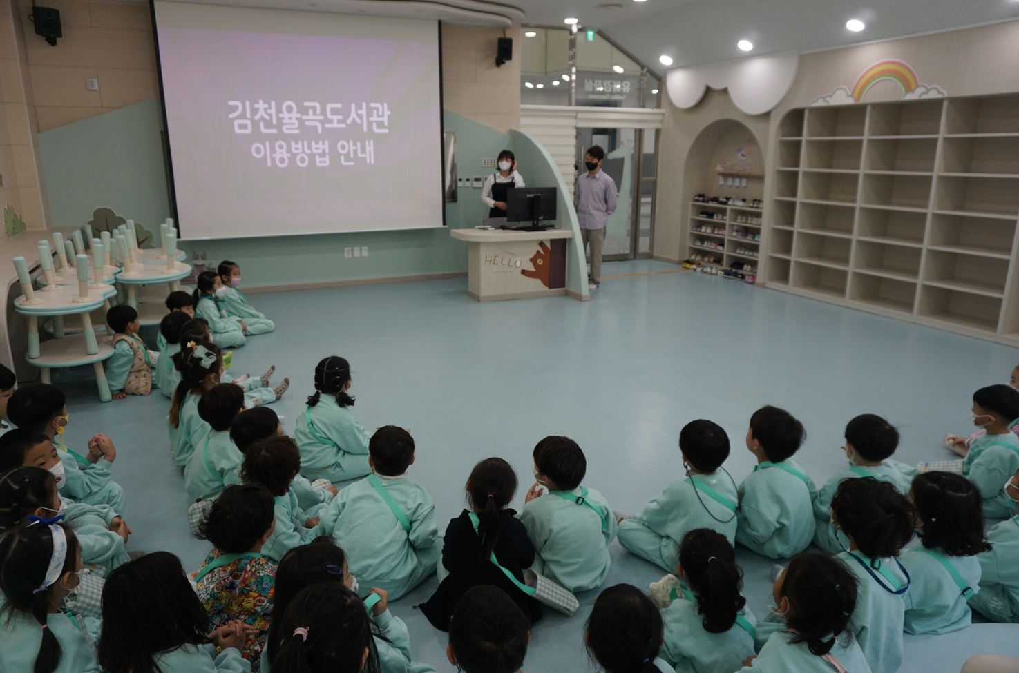 □ 김천시립 율곡도서관에 도착한 후 사서 선생님께서 유아들을 반갑게 맞이해주셨고 함께 1층 유아강좌실로 이동하였다. 유아들은 사서 선생님께 율곡도서관의 시설과 도서관을 이용하는 방법에 대한 설명을 듣고 어린이자료실로 이동하여 읽고 싶은 책을 검색하고, 스스로 책을 찾아 읽어보았다. 그 후, 3층 햇살누리정원으로 이동하여 따뜻한 봄 날씨를 느끼고 즐거운 시간을 보냈다.