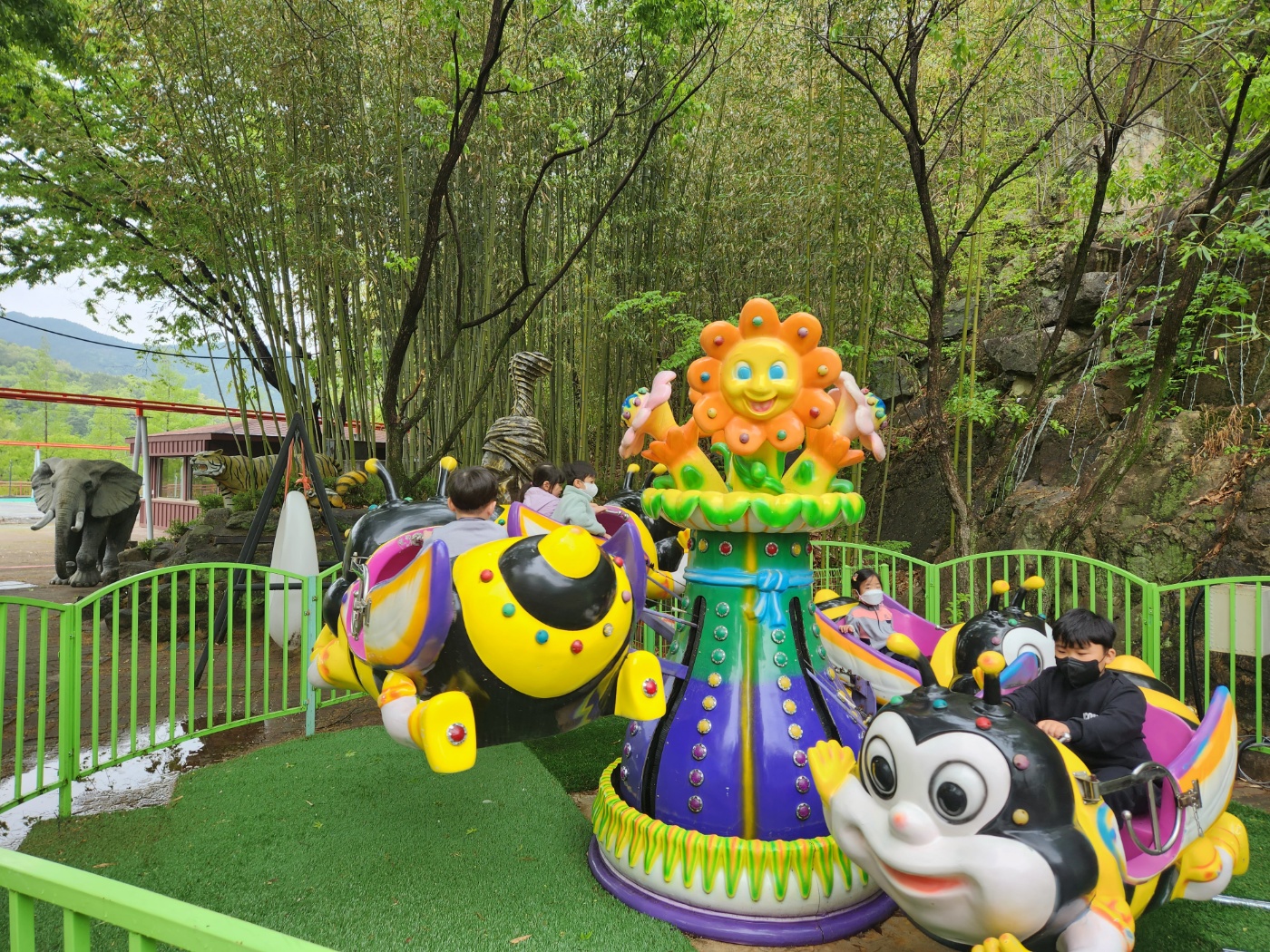 □ 친구들과 맛있는 돈가스를 점심으로 먹고 비가 그친 오후에는 씽씽 꼬마 청룡열차도 타고 회전목마 등 여러 가지 놀이기구를 타면서 즐거운 시간을 보냈다