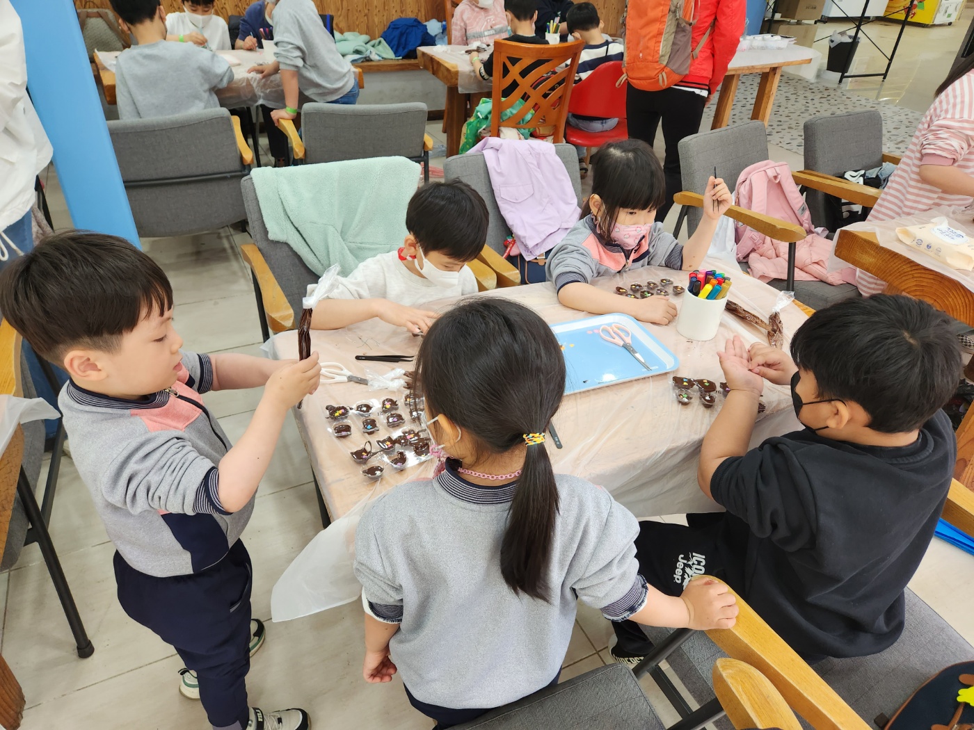 □ 비가 오는 날씨였지만 유아들은 즐거운 마음으로 버스를 타고 출발하였다. 오전 시간에는 실내에서 초코렛 만들기 체험을 하였다. 여러 가지 모양의 초코렛을 만든 후 맛도 보고 엄마 아빠에게 선물로 주기 위해 예쁘게 포장까지 했다.