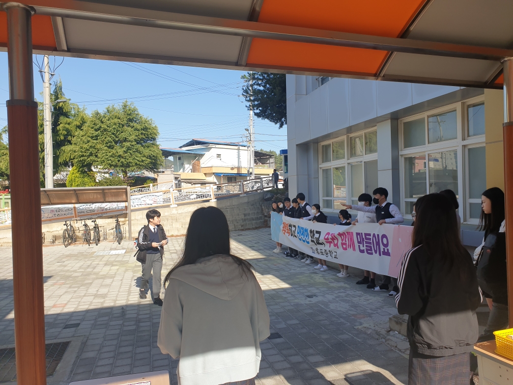 □ 이번 캠페인은 학생회 대의원의 주관으로 진행되었다. 학교 안전 예방을 위한 음악이 울려 퍼졌고 대의원 학생들은 현수막을 들고 학교 안전 예방을 위한 구호를 외치며 학교 안전에 대한 경각심을 제고하였다. 또한 안전한 학교 문화를 정착하기 위해 전 교직원이 함께 캠페인에 참여하여 예방을 위해 힘썼다.