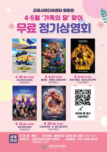 무료 영화 관람 신청은 군포시미디어센터 홈페이지, 전화, 네이버폼 QR코드로 신청할 수 있으며 기타 자세한 내용은 군포시미디어센터로 문의하면 안내받을 수 있다.