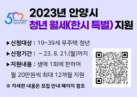 시는 국토교통부가 추진하는 ‘청년 월세 한시 특별지원 사업’과 함께 ‘안양 청년 월세 지원사업’을 추가 실시한다고 20일 밝혔다.