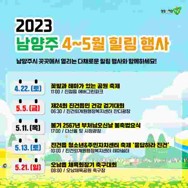 다음 달에는 ‘제24회 진건읍민 건강 걷기 대회’,‘오남읍 체육회장기 축구대회’ 등의 체육 행사와 ‘부처님오신날 봉축법요식 행사’, ‘응답하라 진건’ 등 한층 더 다양한 행사가 마련돼 있다.