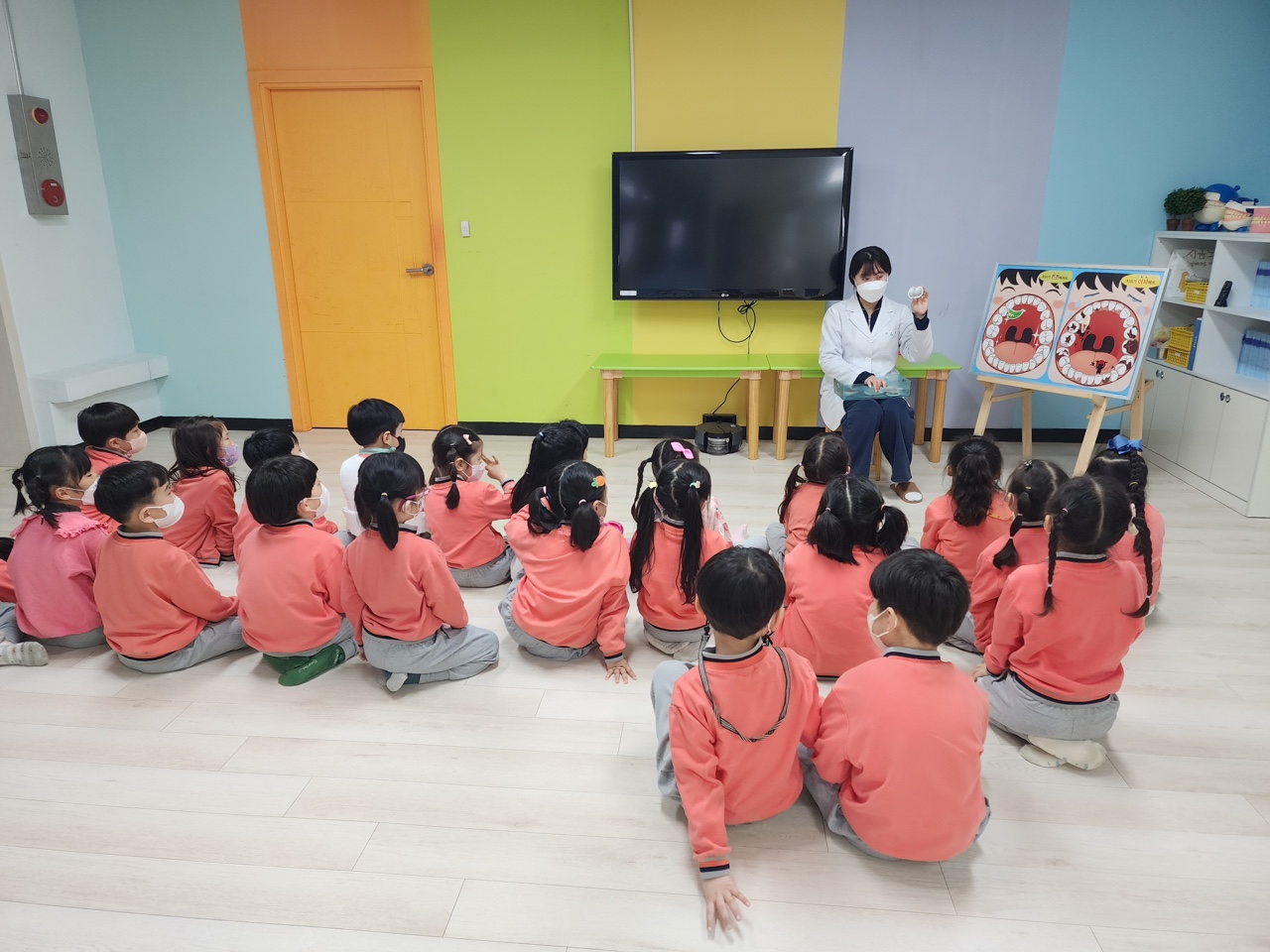 □ 구강 건강 교실에 참여한 oo이는 “치아가 건강해야 몸이 건강해요!” 라며 말하였고, 00이는 “제 치아에 충치가 생기지 않으려면 불소약은 꾹 참을 수 있어요!”라고 말하며 유아들이 건강한 구강 관리를 잘 할 수 있는 좋은 계기가 되었다.