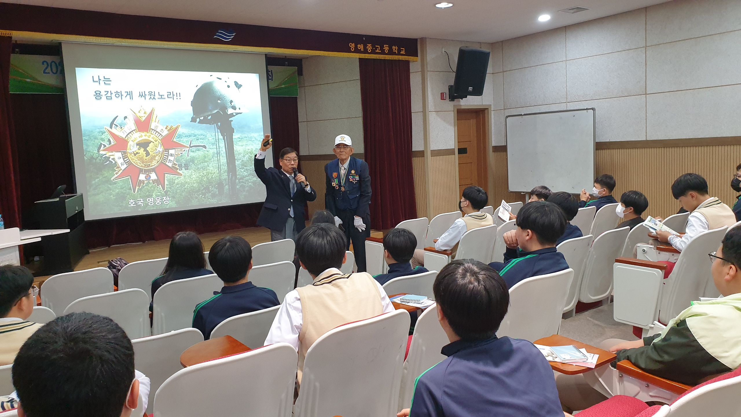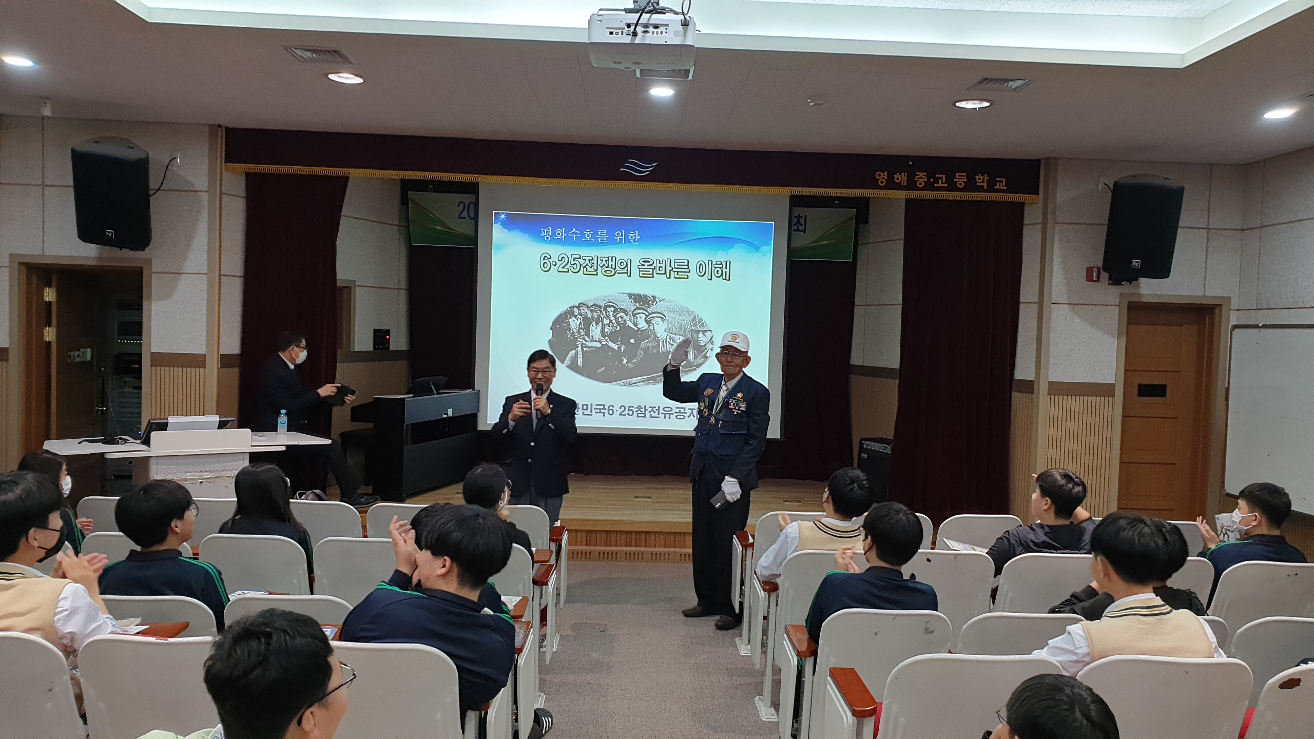 □ 이번 6․25 바로 알리기 교육을 위해 참전 유공자인 이만식 회장이 영해중학교 교육 현장에 직접 참석하여 의미를 더하였고, 교육 전문가인 이상노 교육부장(상담학 박사)이 6․25 바로 알리기 교육을 진행하였다.