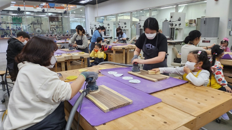 □ 학부모 메이커 체험 교실은 경상북도교육청 메이커 교육관에서 이루어지며 이번 프로그램은 다양한 공구 사용법을 익히고 실용적인 물건 ‘트레이(나무쟁반)’를 제작해보는 목공교실 일일체험으로 이루어졌다.