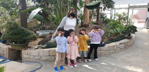 몸으로 체험하며 ABC를 익히는 과정으로 바닥에 분필로 알파벳을 그려두면 아이들이 선생님의 신호에 맞춰 달려가 알파벳을 찾아내는 게임이다8살 자녀와 함께 참여한 한 학부모는, “수목원에서 꽃과 나무를 보며 자연스럽게 체험 활동을 하는 가운데 영어를 접할 수 있어서 숲속에서 힐링도 하고 영어도 접할 수 있어 일석이조의 효과가 있는 것 같다”며 “아이들이 영어로 말하는데 있어 어려움을 느낄까봐 걱정했는데 원어민 선생님이 한국말을 잘 하셔서 좋았다”고 말했다.
