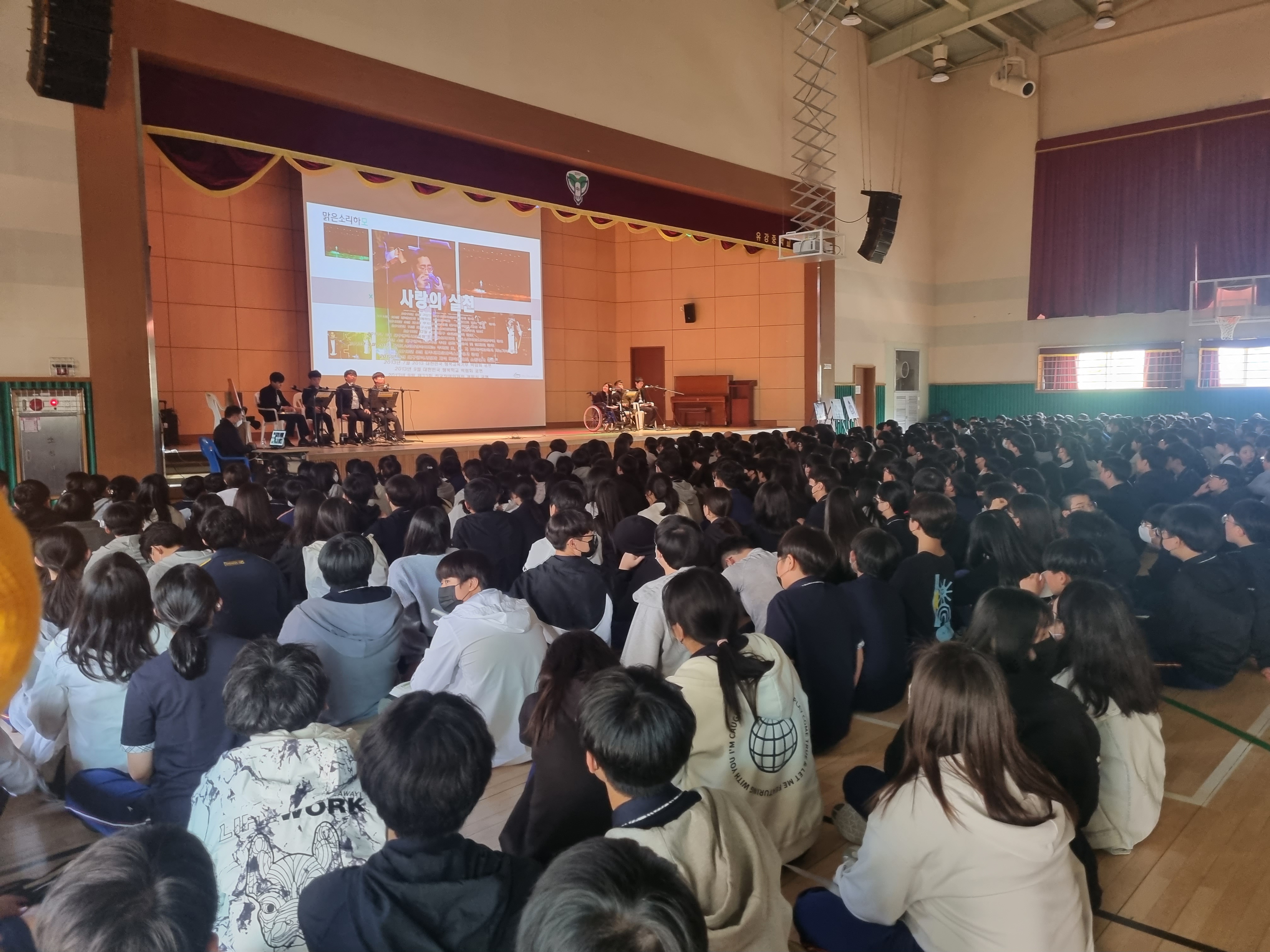 유강중학교(교장 이호준)는 4월 19일(수) 전교생과 전체 교직원을 대상으로 강당에서 ‘맑은소리 하모니카 앙상블’ 공연을 관람하며 장애인식개선교육을 실시하였다.