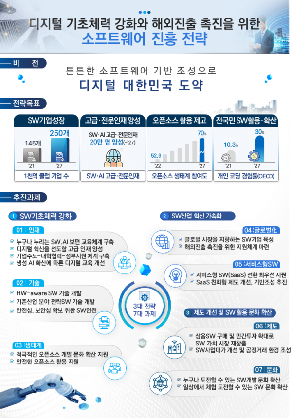 글로벌 시장을 지향하는 강소 소프트웨어 기업 육성, 전단형 수출, 해외진출 촉진 지원체계 마련 등을 통해 소프트웨어 매출 1천억 클럽 기업을 ’21년 145개에서 ’27년까지 250개 이상 육성할 계획이라고 전했다.