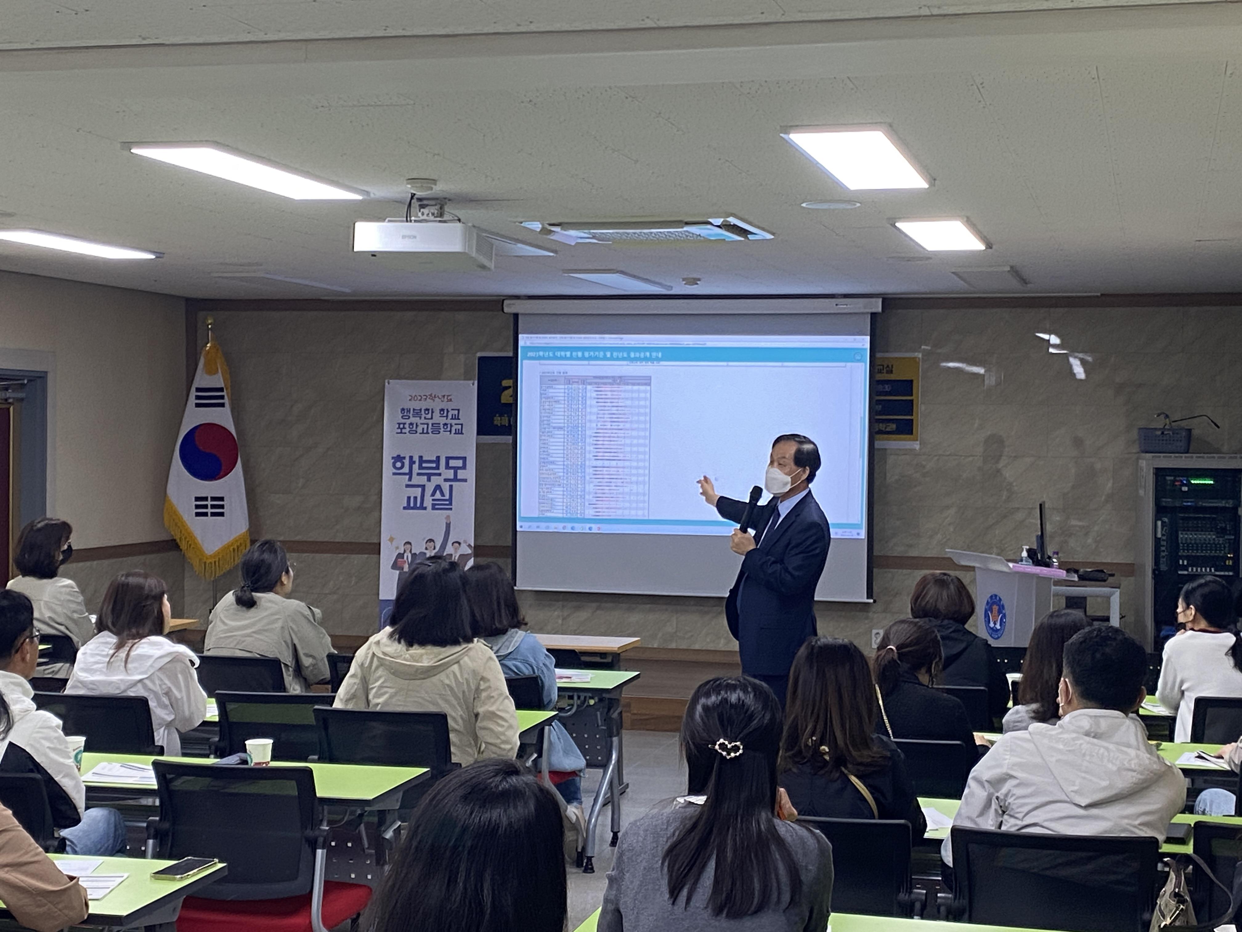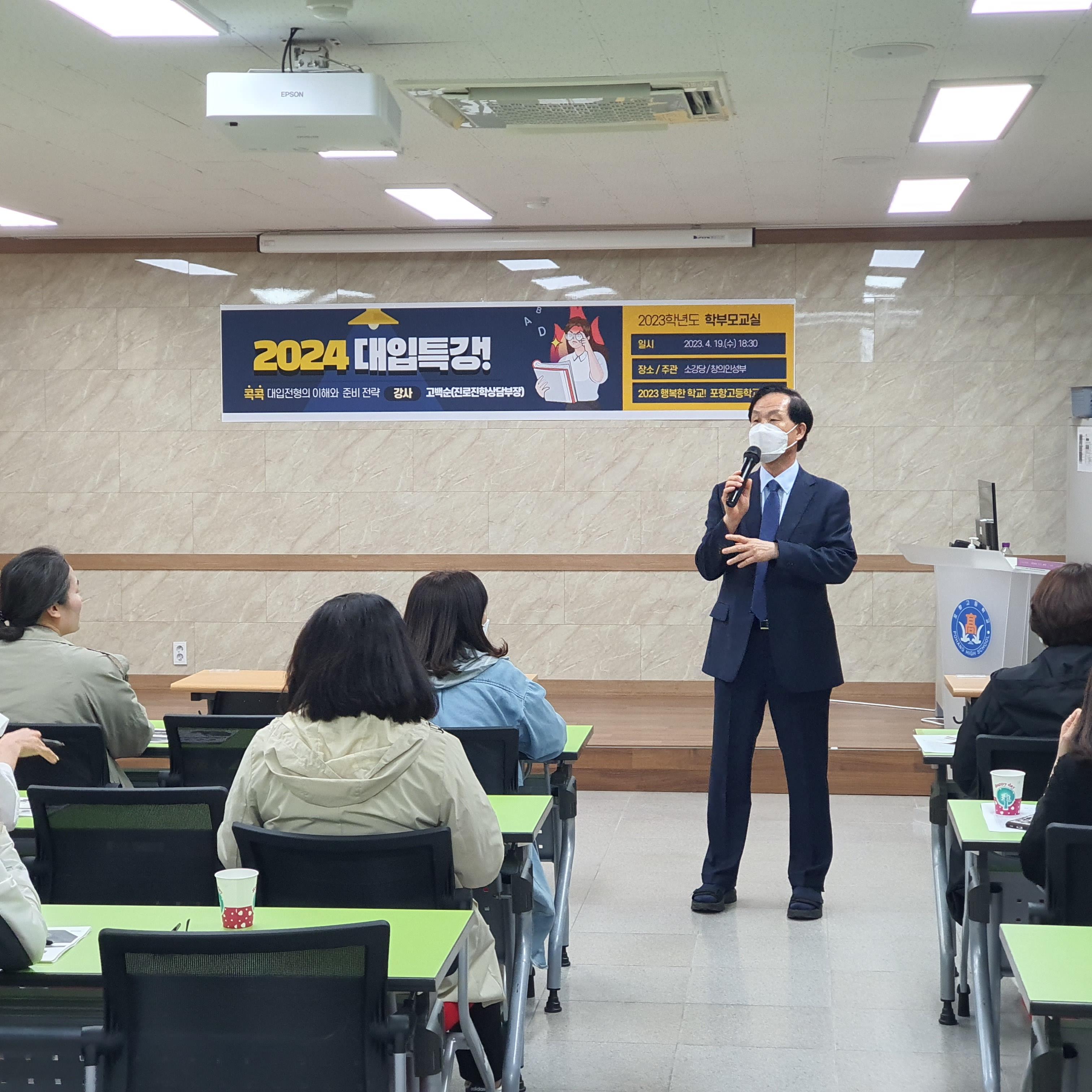 □ 포항고등학교(교장 류성연)가 2023년 4월 19일(수), 오후 6시 30분부터 본교 소강당에서 80여명의 1, 2학년 학부모를 대상으로 2024 대입전형의 이해와 준비전략을 주제로 하는 대입 특강을 개최하였다.