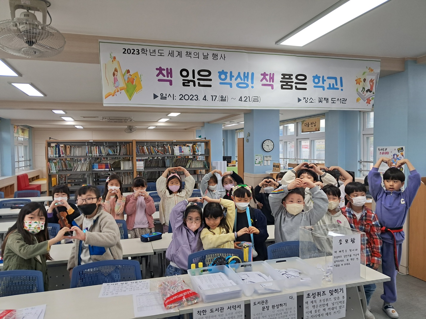 □ 세계 책의 날을 맞아 ‘꽃재 도서관’에서 열리는 독서 행사에 참여한 학생들은 착한 도서관 서약서 작성하기, 초성퀴즈로 책 제목 맞히기, ‘도서관은 ( )이다’ 문장 만들기, 반별 도서관 방문 인증샷 찍기 활동을 하면서 책과 더 가까워지고 독서의 즐거움을 한껏 느끼게 되었다.