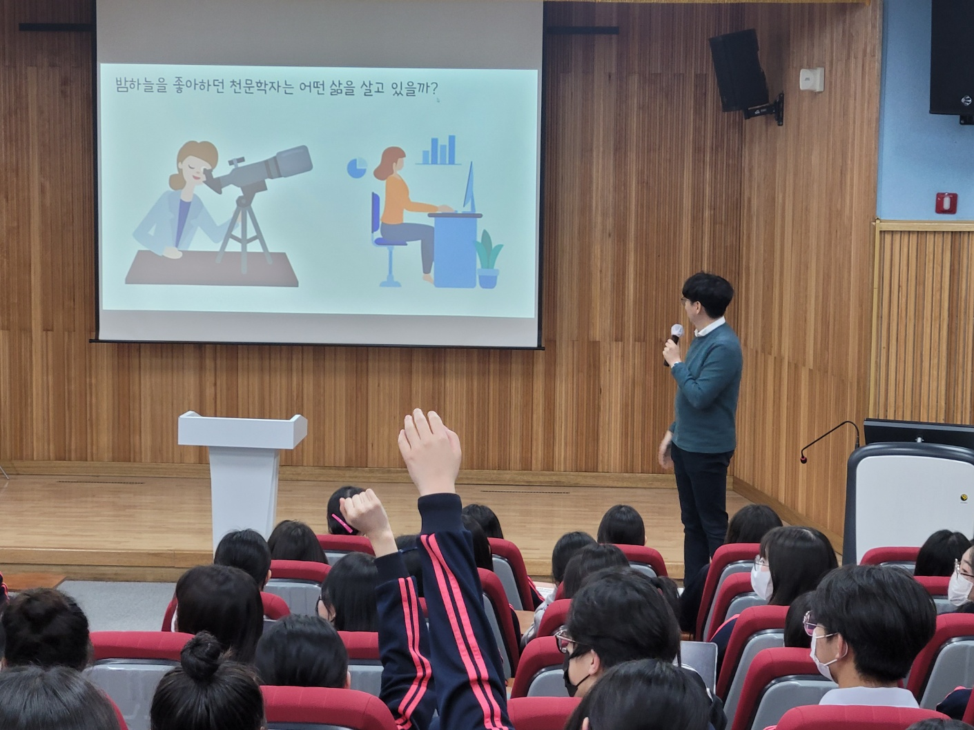 □ 특강을 들은 학생들은 “과학자가 되려면 과학만 잘하는 것이 아니라, 영어와 코딩도 잘해야 한다는 것을 알게 되었다.”(1학년, 김OO)“자신감을 가지면 언젠가 원하는 꿈을 이룰 수 있다는 교수님의 말씀이 인상 깊었다.”(1학년, 이OO)“천문학 전공자들의 진출 분야와 전문 과학자는 아니지만 전공 분야를 살릴 수 있는 다양한 분야에 대해 알게 되어 진로 모색에 도움이 되었다.”(1학년, 정OO)“어디까지가 과학자의 범위일지 늘 궁금했는데 교수님의 설명으로 알게 되어 내 꿈을 위해 도전하고 싶은 용기가 생겼다.”(1학년, 최OO)라고 소감을 밝혔다.