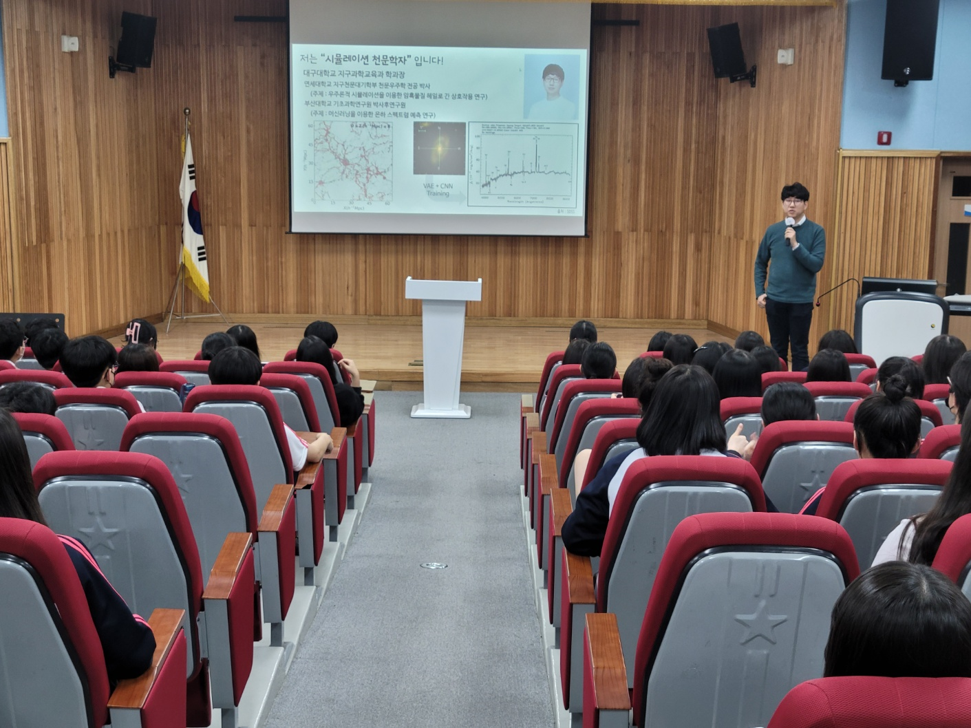 □ 특강은 최신의 이공계 분야에 관심과 흥미를 갖고 진로를 설계할 수 있도록 구성되었고 자연과학 분야에 관심 있는 학생들 100여명이 참석한 가운데 1시간 동안 진행되었다. 자신을 시뮬레이션 천문학자라고 소개한 안성호 교수는 과학이 재미있다는 것을 학생들에게 알리기 위해 과학 그림책 번역, 유튜브(스페이스Y), 네이버 블로그(이과굄성콤), 인스타그램(도치파파의 우주이야기) 운영 등을 하며 왕성히 활동하고 있다.