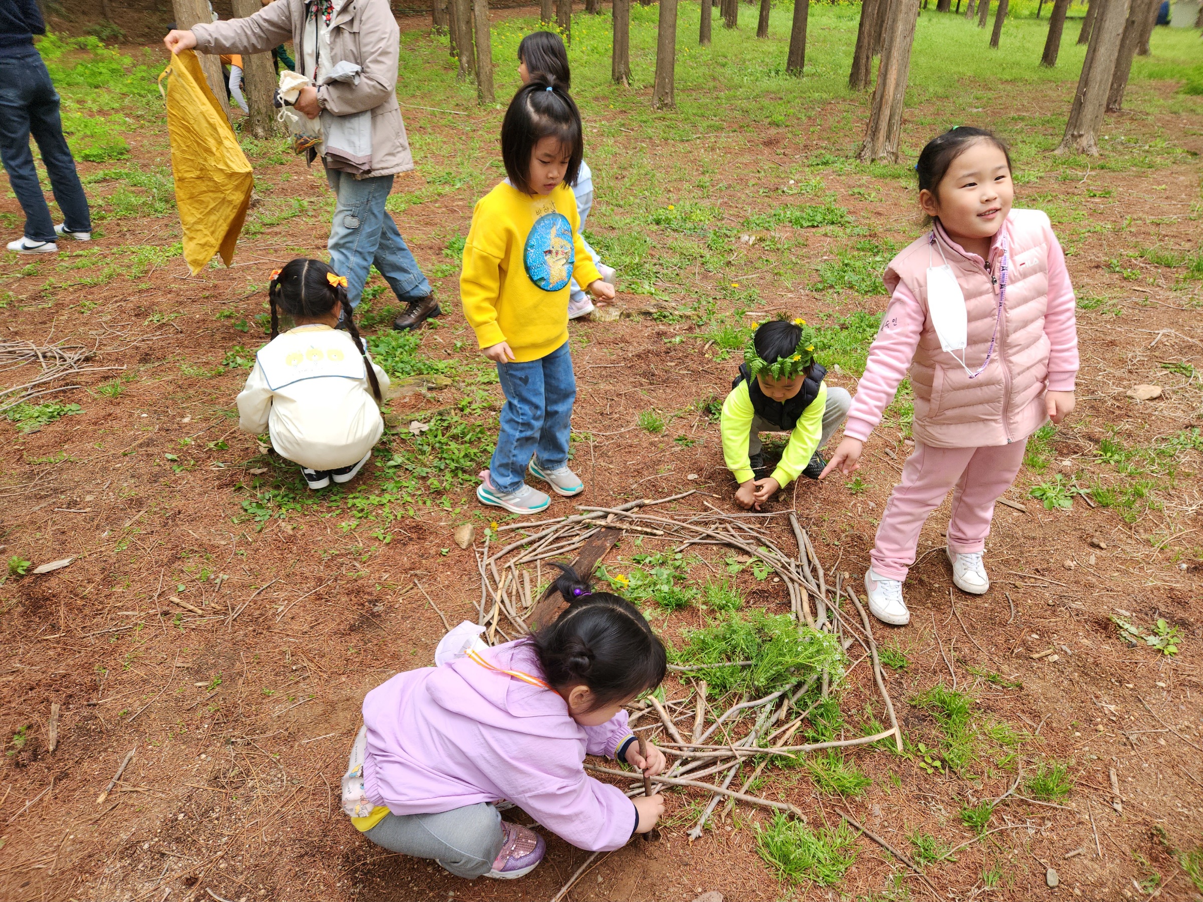당일 지역사회의 숲놀이 전문가인 반디학교 반딧불이 선생님의 도움으로 여러 가지 숲놀이 활동을 하였다. 아이들은 나뭇가지를 주워서 새둥지를 만들기도 하고 여러 가지 꽃과 풀로 숲의 요정과 같은 화환을 만들어 쓰기도 했다.