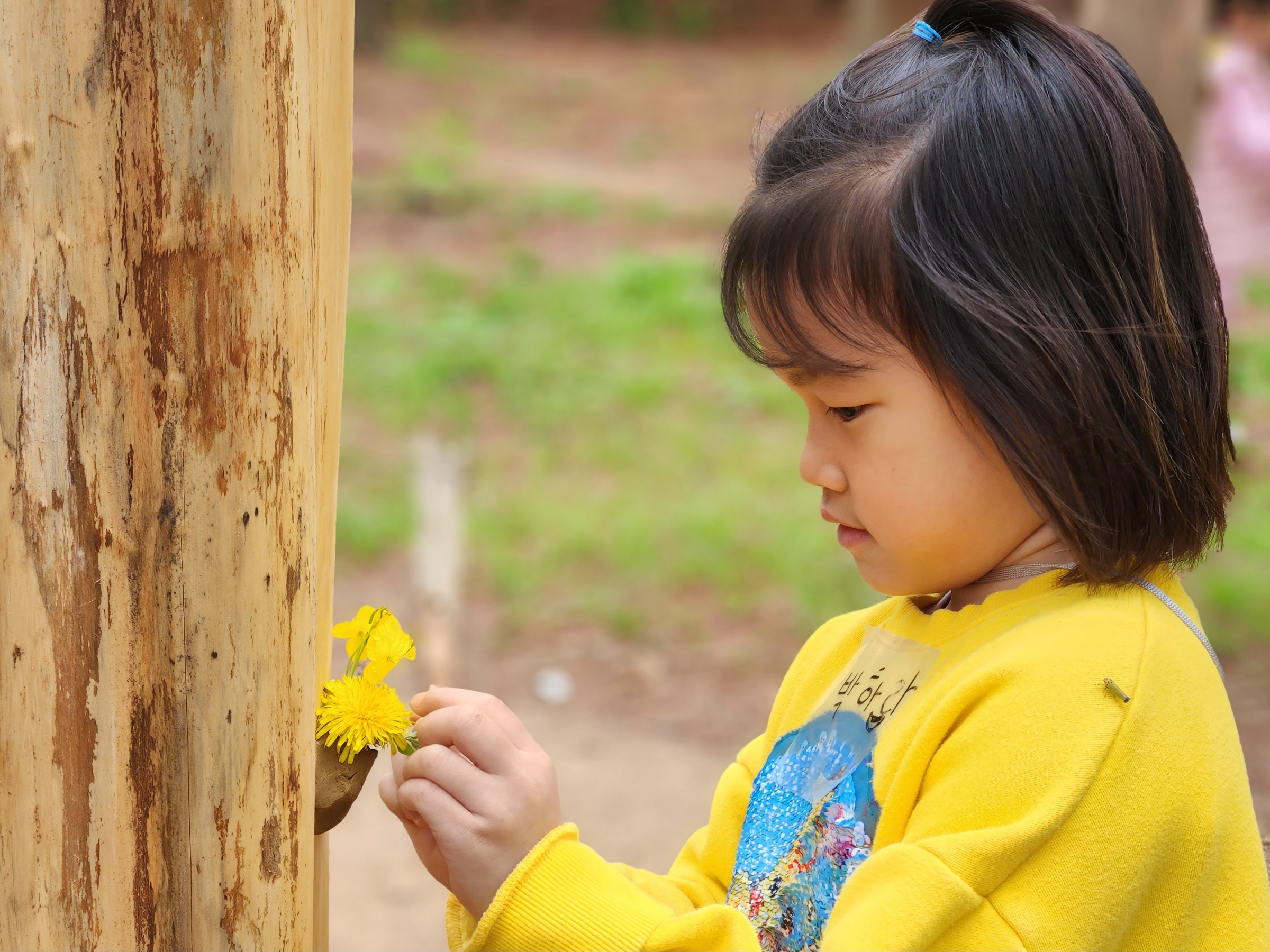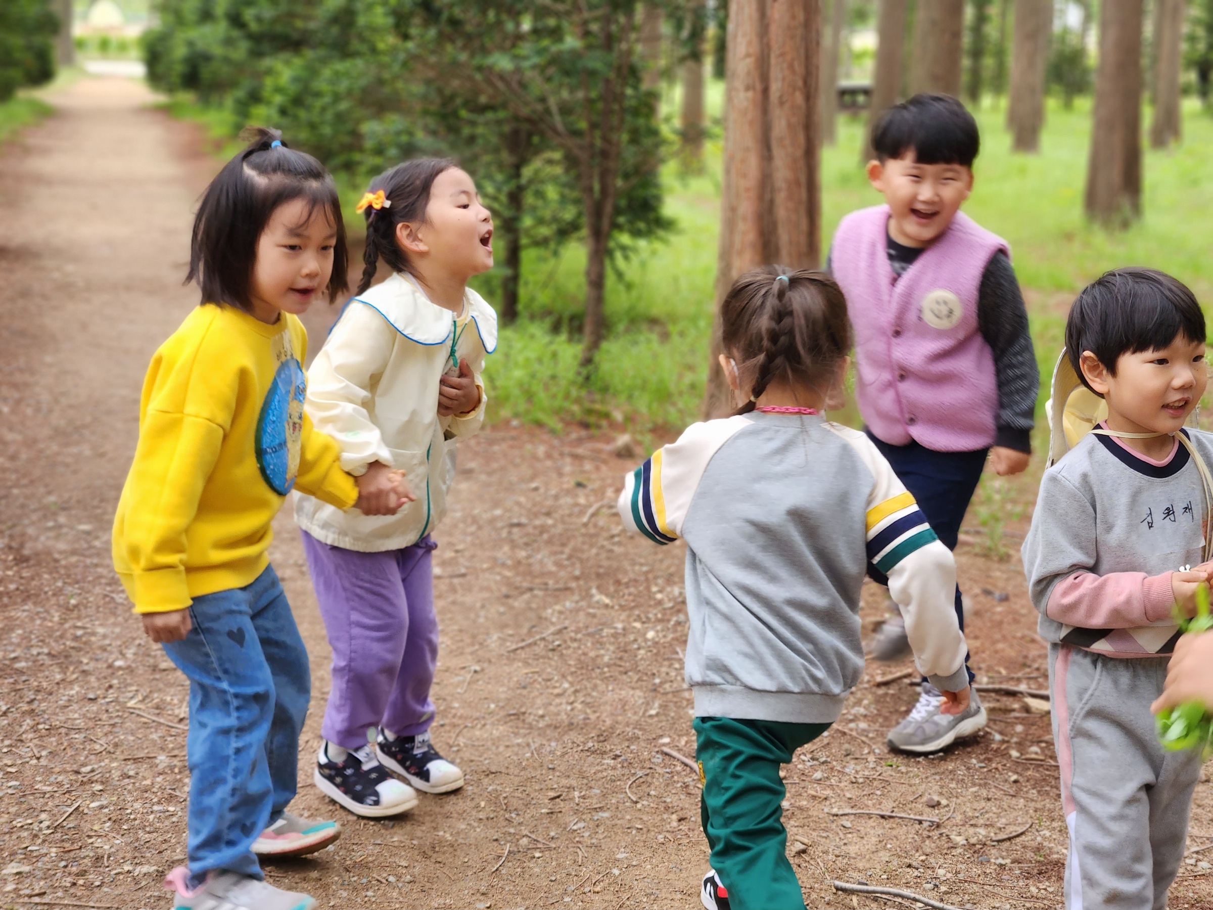 초록색 풀들 사이로 빛나는 노란색 애기똥풀로 손톱에 칠하기놀이, 내 나무를 정해서 꼭 안아주기, 나무에 예쁜꽃을 따서 선물하기, 키가 큰 메타쉐콰이어나무 숨바꼭질 등을 하느라 연거푸 깔깔웃음을 쏟아냈다. 그 모습을 바라보는 교사들과 어른들의 마음도 따스해지는 것을 느낄 수 있었다.