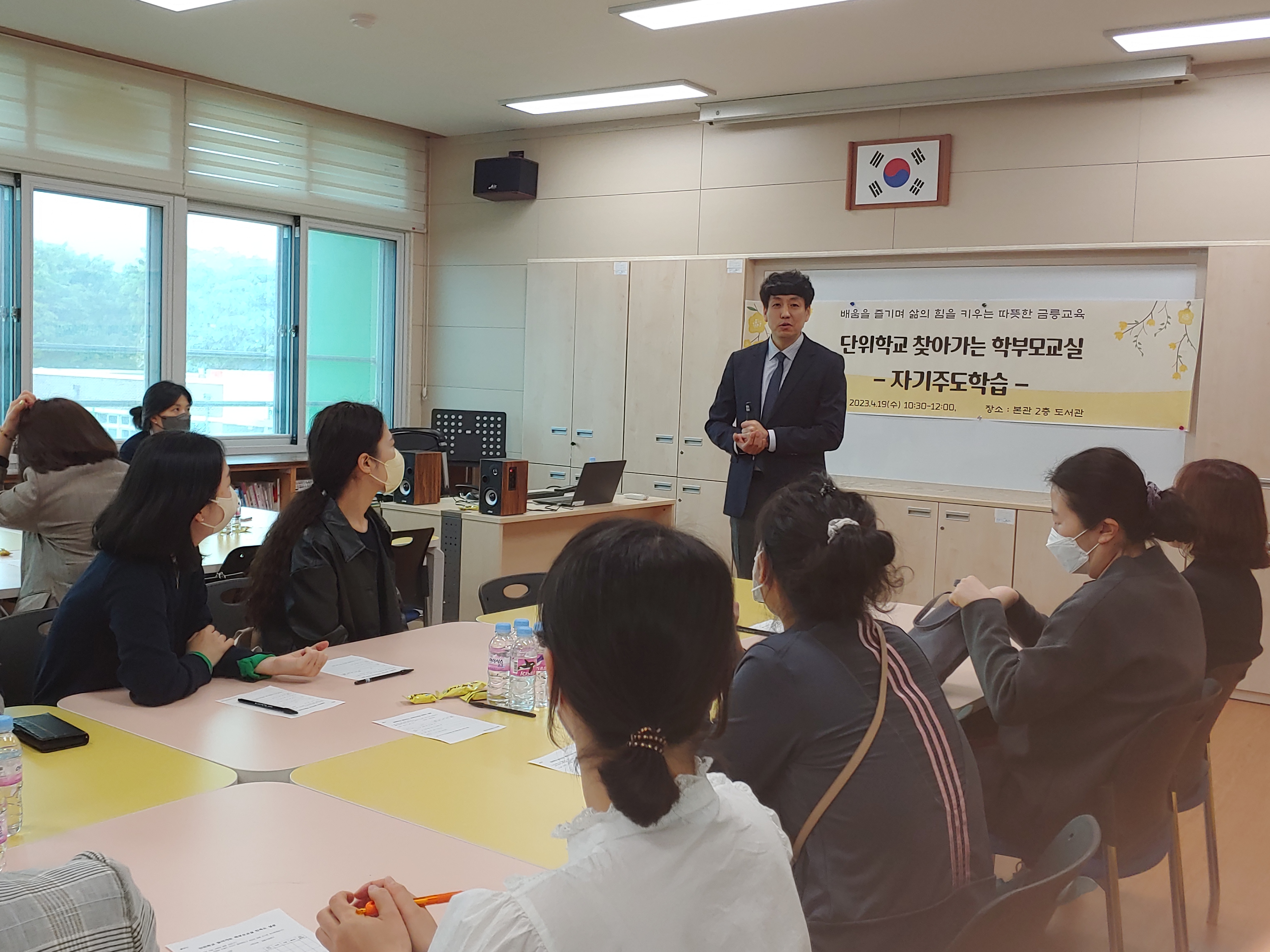 금릉초등학교(교장 황연옥)는 2023년 4월 19일 (수) 본교 도서관에서 단위학교 찾아가는 학부모교실을 열었다. 자기주도학습이란 주제로 자녀 교육에 도움이 되는 다양한 지식과 정보를 학부모에게 안내하였다.