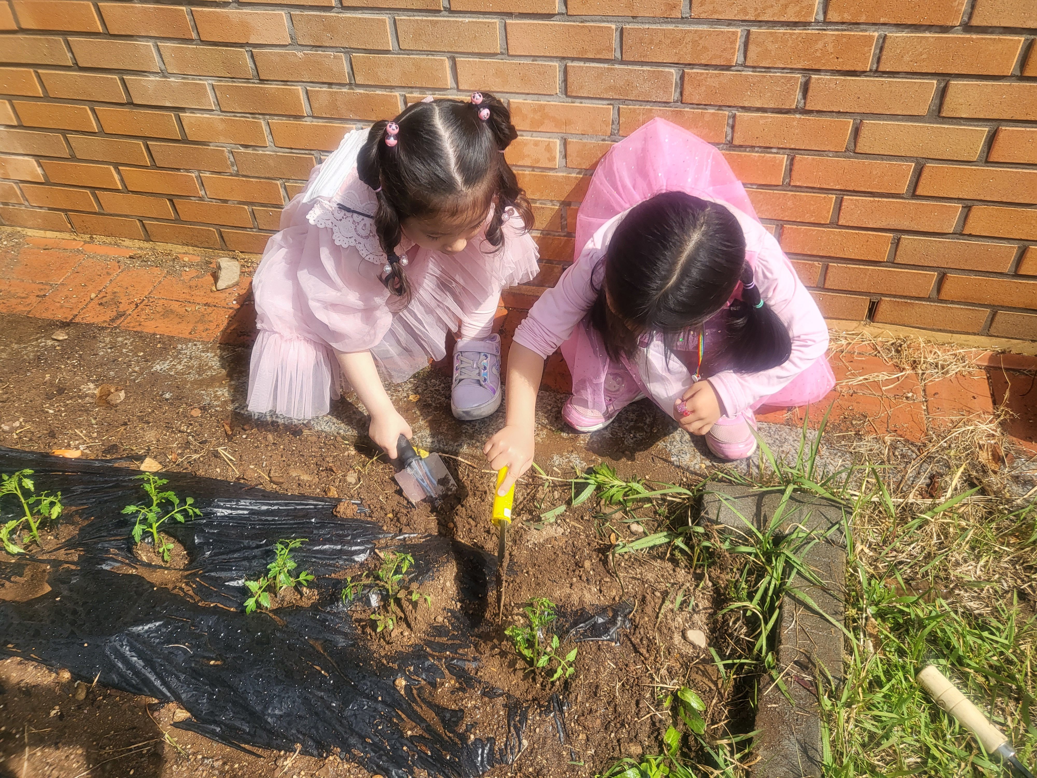텃밭 식물은 오이고추, 토마토, 등을 준비하였다. 식물을 심기 전 식물(채소)의 이름과 심는 방법 등을 알아본 후, 유아들이 직접 식물 모종을 텃밭에서 직접 심어보고 물을 주었다.
