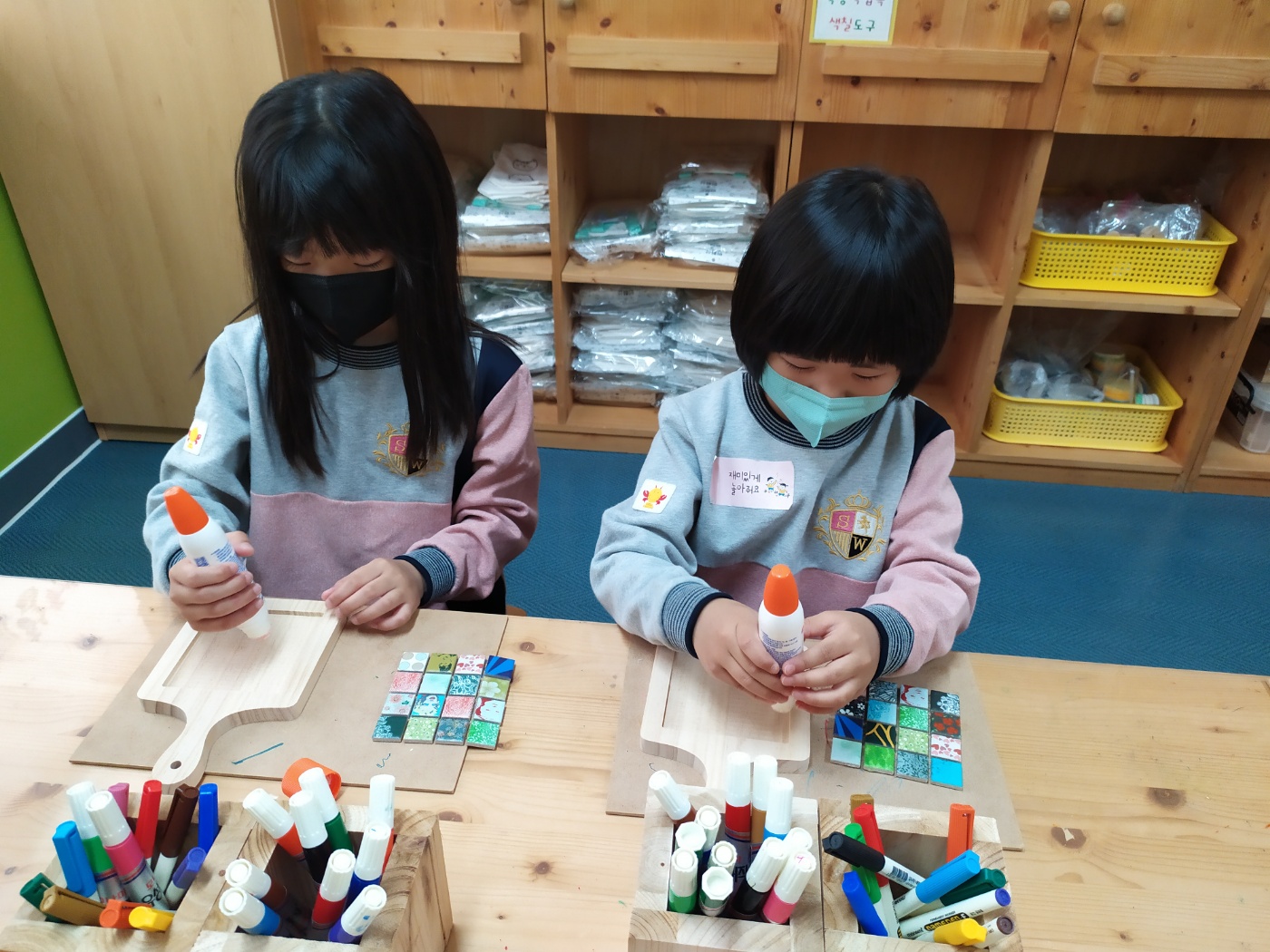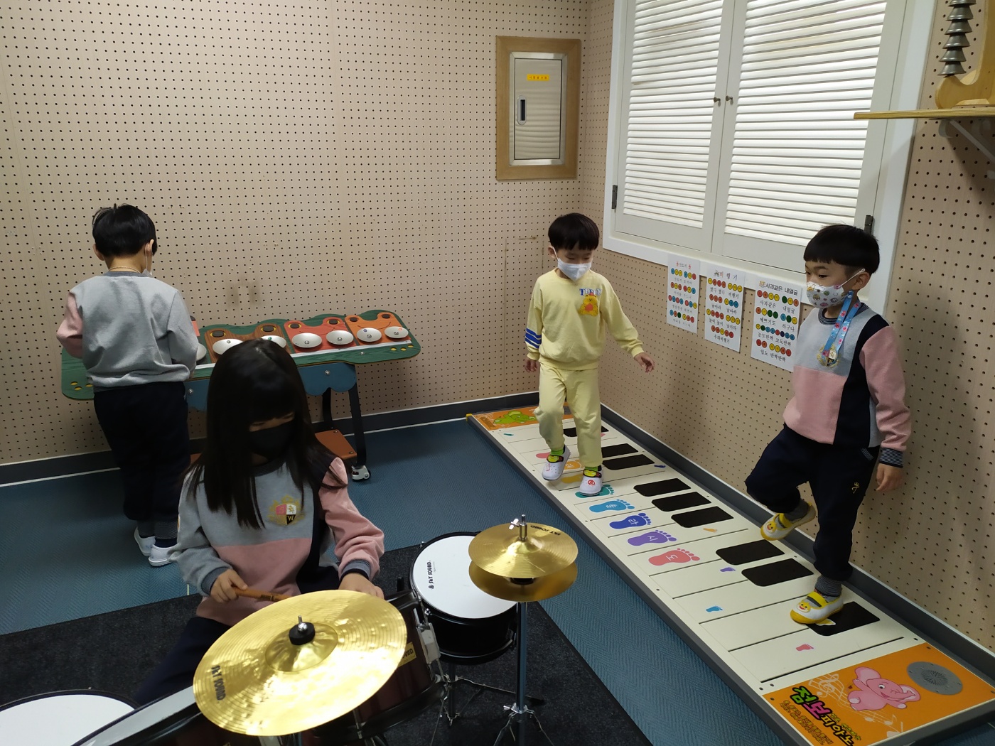 □ 먼저 유아들은 안전하게 놀이하기 위한 약속들을 이야기 나누고 표현누리방에서 체험활동을 진행하였다. 자동차를 타며 캠핑 가자고 이야기하기도 하며 그릴 놀잇감에 음식 모형을 구워서 친구와 나누어 먹기도 하였다 소리나라에서는 유치원 원가를 부르며 다양한 악기를 연주해보기도 하였고, 연지곤지방에서 미용사가 되어 친구들을 아름답게 꾸며주기도 하며 웃음이 가득한 체험 시간을 보냈다.