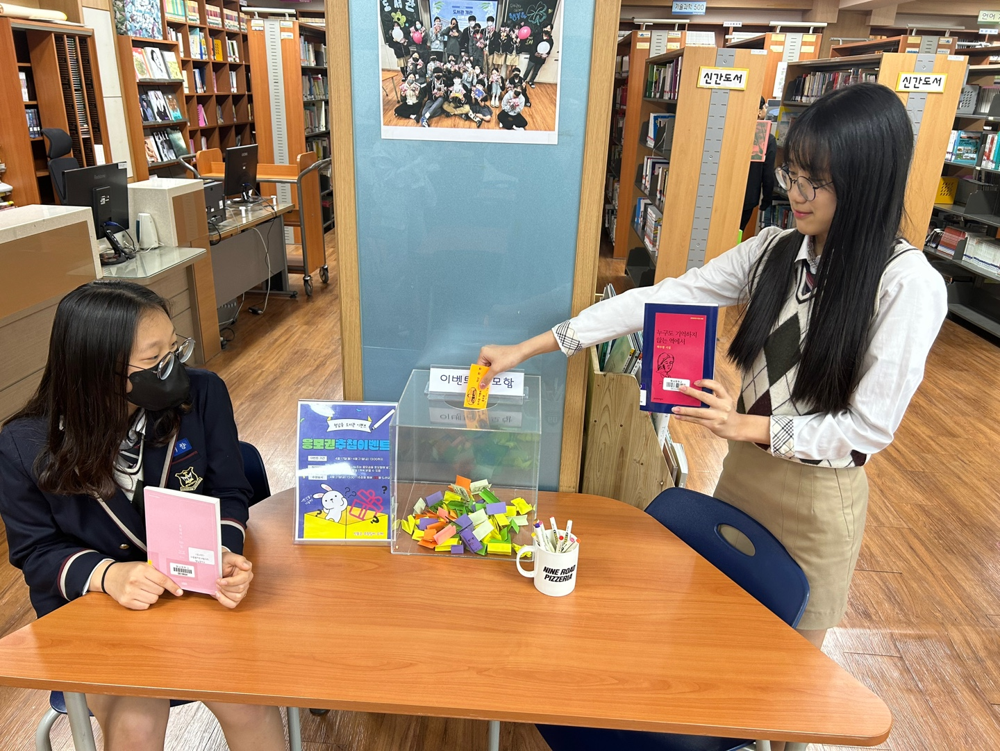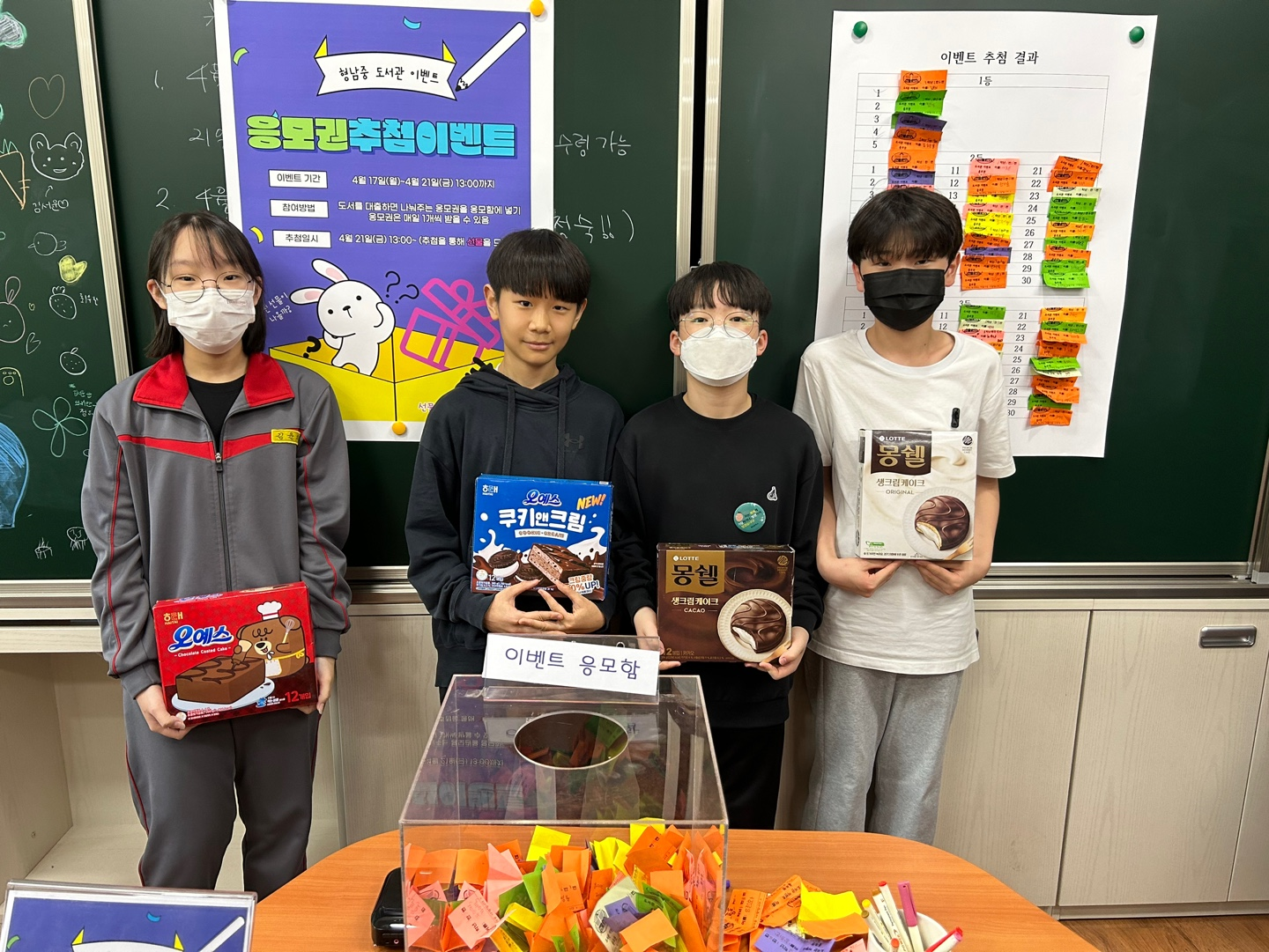 □ 지난 4월 17일(월)부터 4월 21일(금)까지 5일간 학생들이 도서관에서 책을 대출하면 매일 1장의 응모권을 나누어 주었으며, 5일간의 응모권을 모아 추첨을 통해 선물을 나누어 주는 방식으로 진행되었다. 이번 응모권 추첨 이벤트는 학생들의 도서관 생활화와 더불어 도서관 이용의 또 다른 즐거움을 인식시킴으로써 즐거운 학교생활을 만드는 것에 목적이 있다.