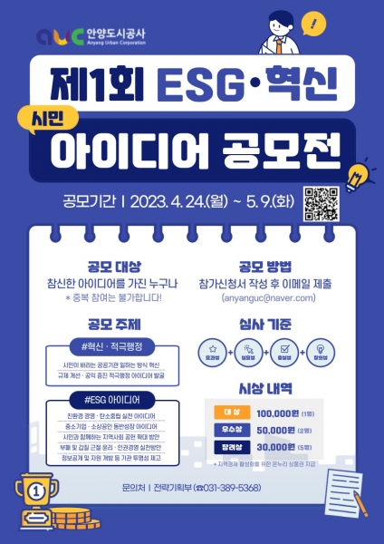 [금요저널] 안양도시공사는 5월 9일까지 시민 눈높이에 맞는 혁신경영 수행을 위한 ‘ESG·혁신 아이디어 공모전’을 개최한다고 25일 밝혔다.