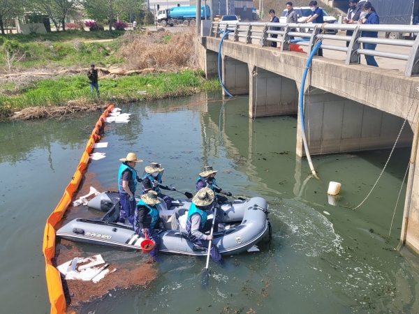 이날 훈련은 검단천 하류에서 원인불명 유류가 하천으로 유입된 상황을 설정하고 사고현장 수습과 초동조치 중심의 기동훈련을 진행했다.