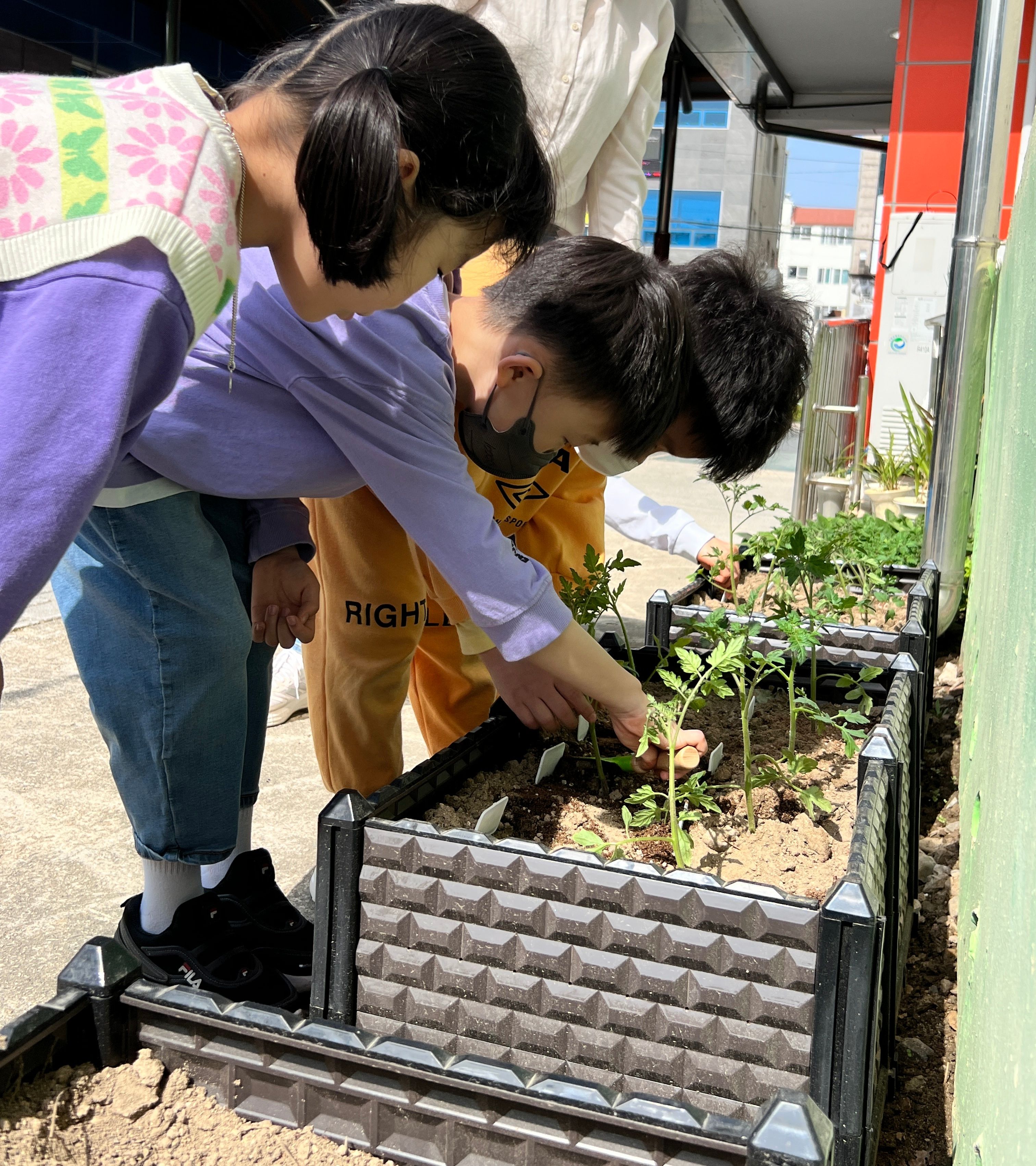 ❏ 유치원생 1명과 초등학생 1명은 서로의 꿈을 응원하며 함께하는 꿈메이트가 되어 짝을 구성하였다. 꿈메이트가 된 친구들은 함께 힘을 합쳐 방울토마토, 가지, 상추 등 여러 모종을 심어보았다. 형님 1학년 친구들은 동생인 유치원 친구들을 챙기는 모습을 볼 수 있었다. 한 명은 모종을 잡고, 다른 한 명은 흙을 덮으며 협력하니 이마에 땀방울이 송글송글 맺혔다.