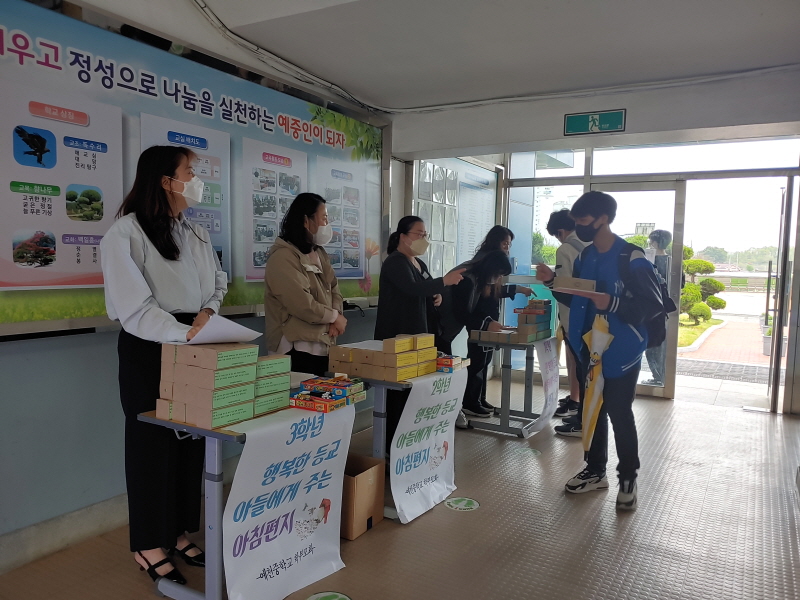 □ 학부모회 임원과 교사는 등교하는 학생들을 반갑게 맞이하면서 삶의 용기와 지혜를 주는 어머니의 마음이 담긴 편지를 읽어 주고 선물을 증정하여 학교 생활을 응원하고 격려해 주었다.