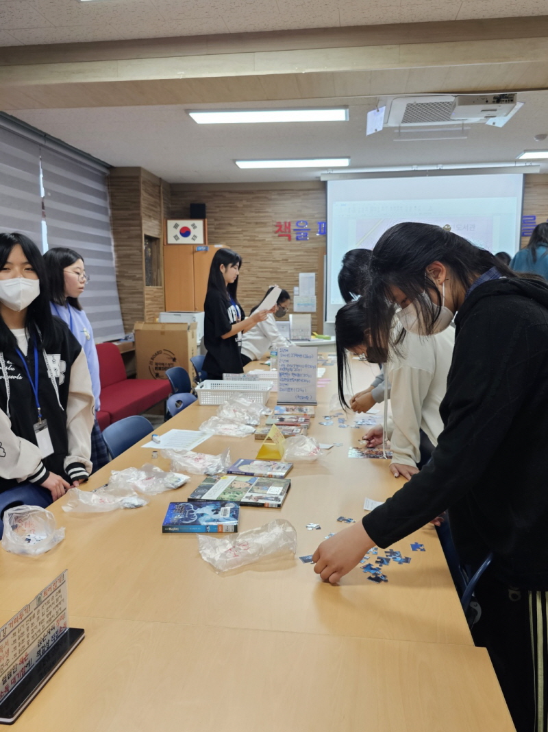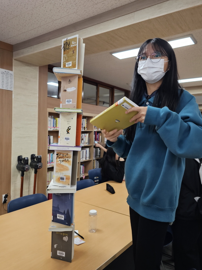 학생들이 좋아하는 책표지를 퍼즐로 만들어, ‘책표지 퍼즐 맞추기’,‘북타워’쌓기,‘너의 이름은’코너와 북스타그램 독서사진찍기 등 흥미 있는 독서 행사로 한바탕 즐거웠으며, 캘리그라피 시 쓰기, 독서 카드 쓰기, 목련도서관 5행시쓰기 등의 차분한 독서 미션을 통해 소통과 공감의 시간을 가졌다.