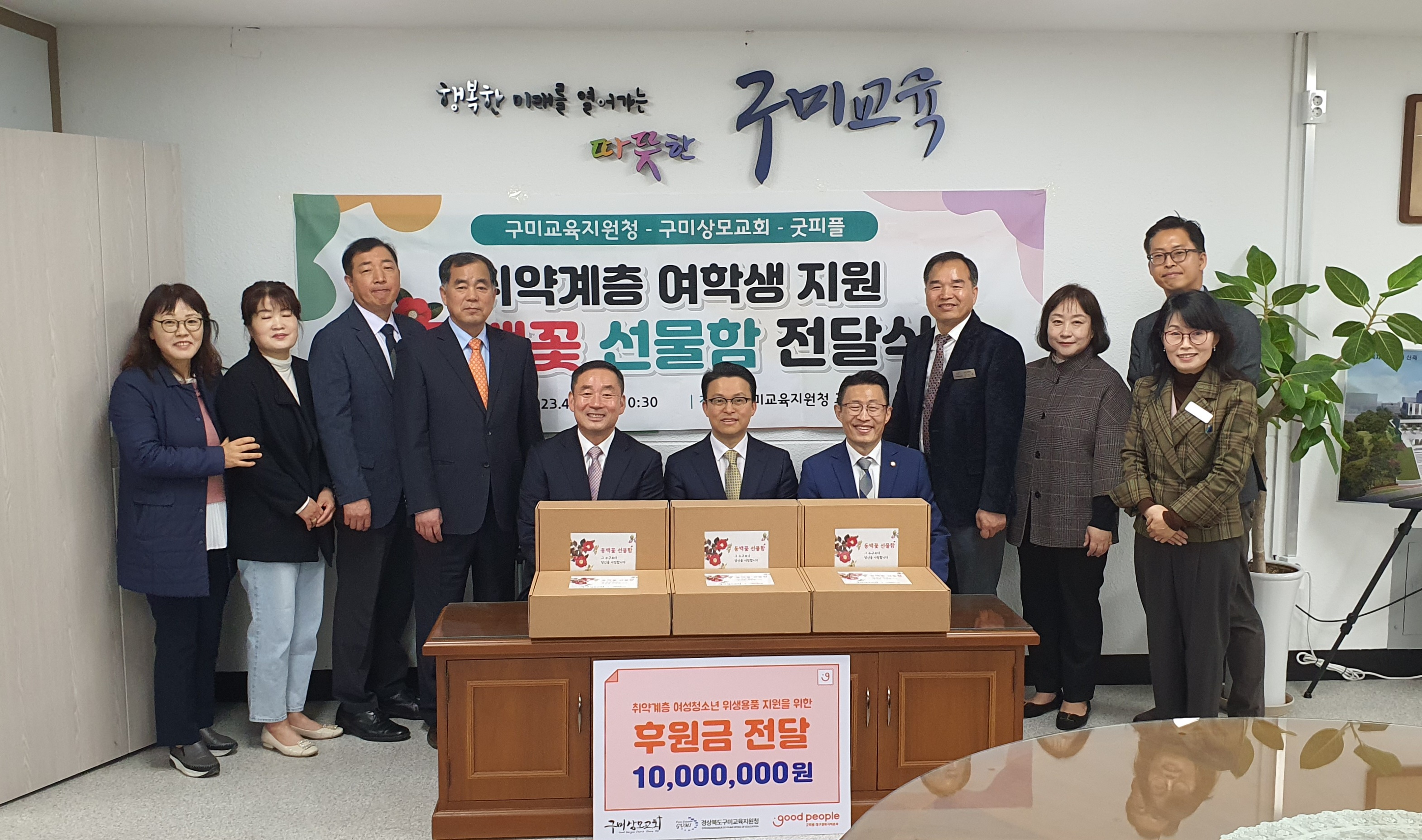 □ 구미교육지원청(교육장 이성희)은 4월 25일 10시30분 교육장실에서 굿피플 대구경북지역본부, 구미상모교회, 구미교육지원청 관계자 등 10여명이 참석한 가운데 ‘동백꽃 선물함’전달식을 가졌다.