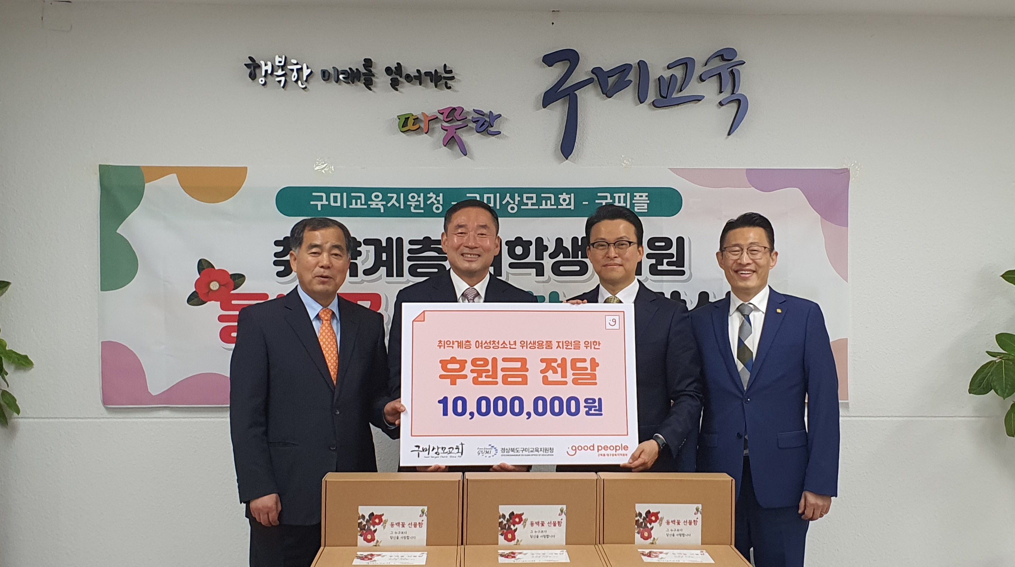 □ 굿피플 대구경북지역본부는 취약계층 여학생들의 건강한 성장지원을 위해 구미상모교회로부터 1,000만원을 후원을 받아 성장기에 있는 여학생들에게 꼭 필요한 위생용품 및 생필품으로 ‘동백꽃 선물함’ 세트 90box를 만들어 구미교육지원청에 전달했다.