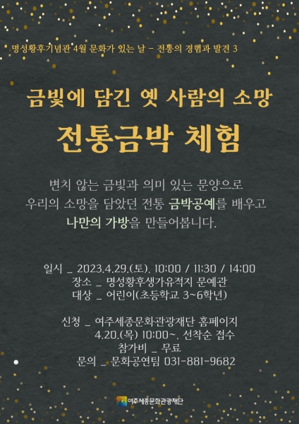 [금요저널] 여주세종문화관광재단은 오는 29일 명성황후기념관 4월 문화가 있는 날 프로그램 으로‘금빛에 담긴 옛 사람의 소망 - 전통금박 체험’을 진행한다.