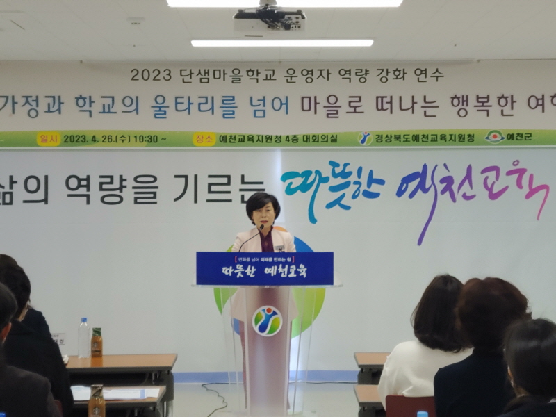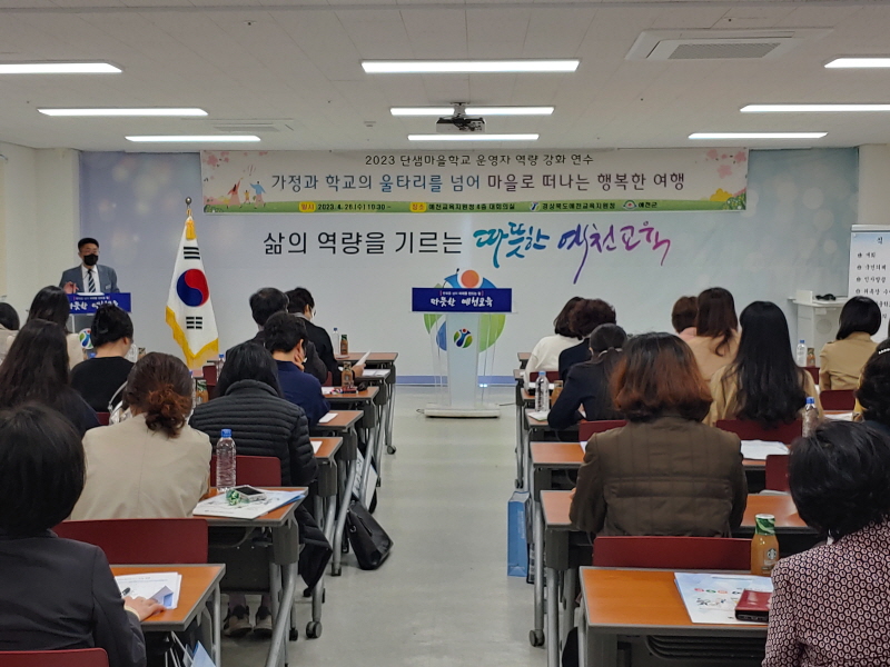 □ 예천교육지원청(교육장 권혜자) 4월 26일(수) 예천교육지원청 4층 대회의실에서 마을학교 운영자 9명과 마을교사봉사단 33명을 대상으로 예천미래교육지구 단샘마을학교 운영자 연수회를 실시했다.