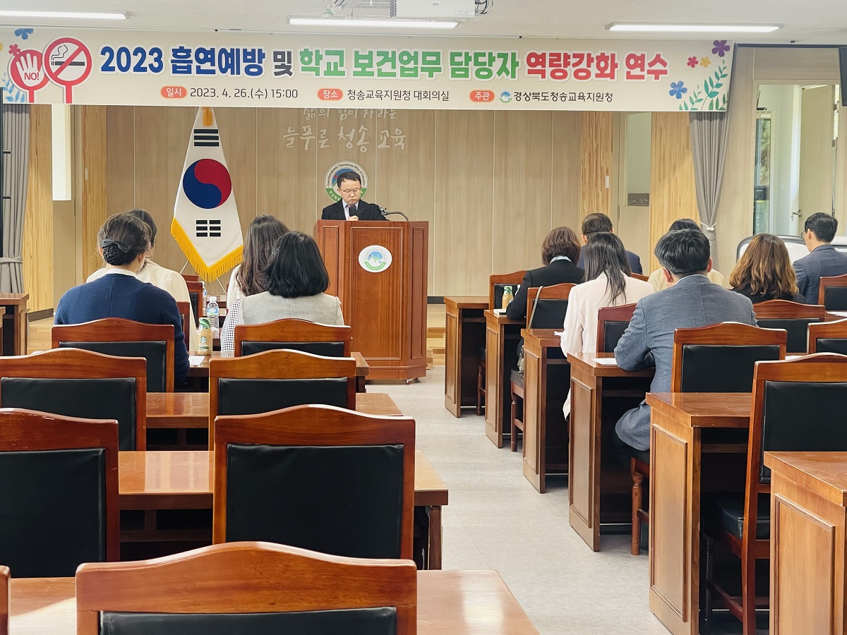 □ 청송교육지원청(교육장 이호경)은 내실있는 학생 흡연, 마약류 등 약물 오남용 대응을 마련하고, 학생들의 건강한 성장․발달을 체계적으로 관리하기 위하여 4월 26일(수) 2023년 학교 보건업무 담당자 역량강화 연수를 실시하였다.