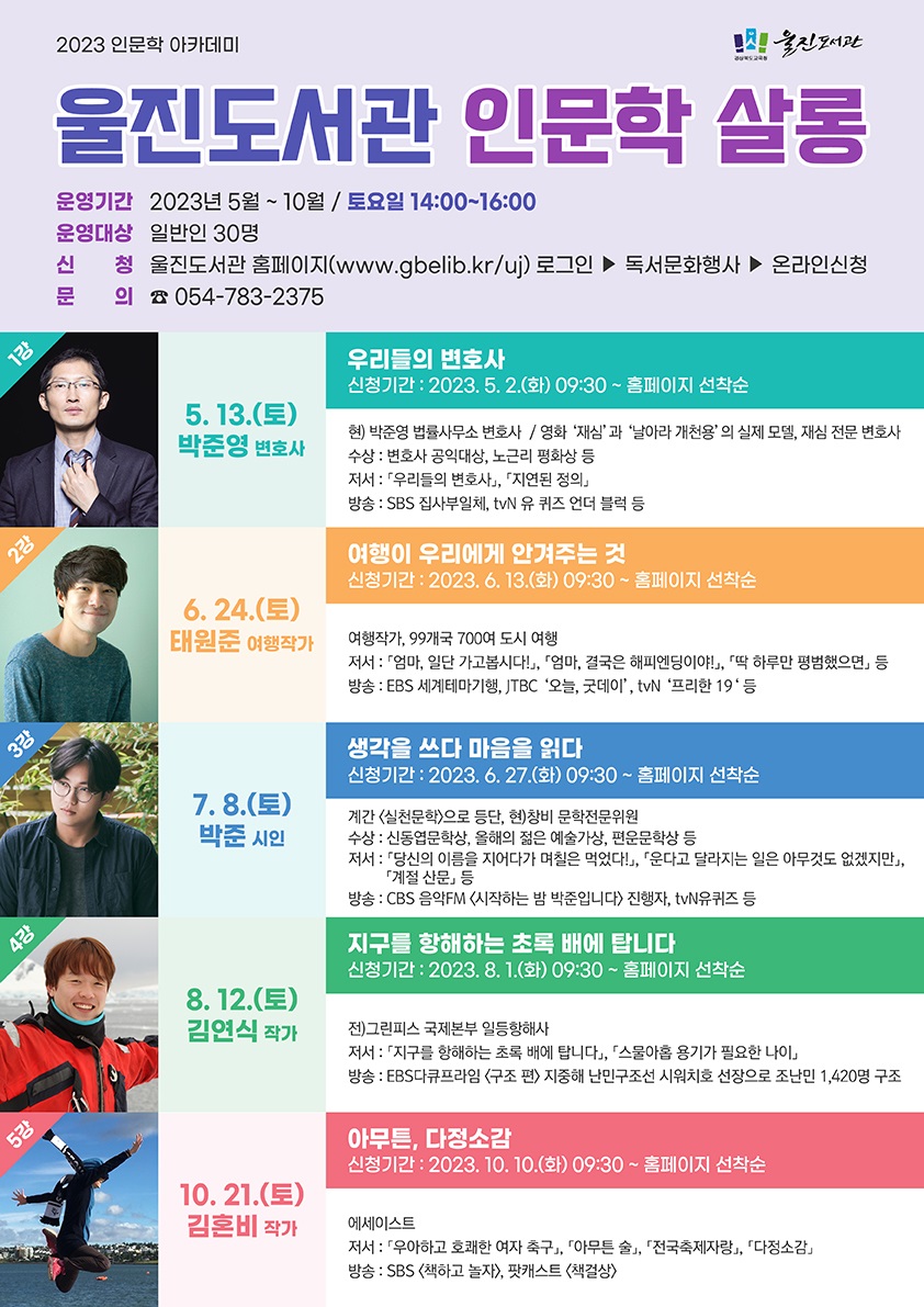 □ 경상북도교육청 울진도서관(관장 천재탁)은 5월부터 10월까지 지역주민을 대상으로 2023년 인문학 아카데미「울진도서관 인문학 살롱」을 운영한다.