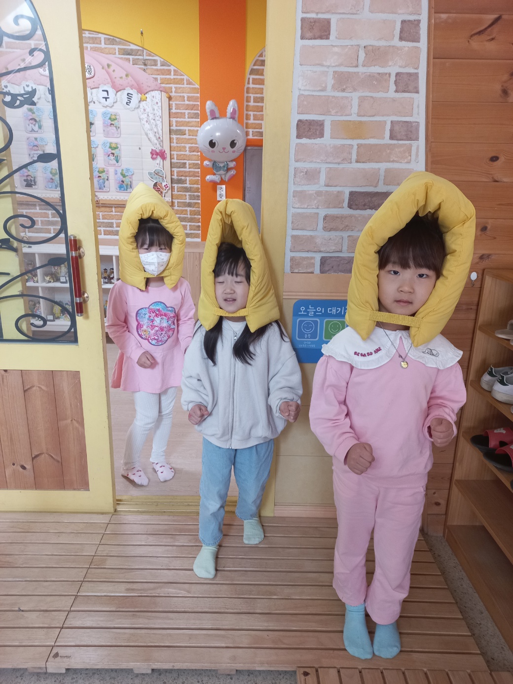 ▣ 대피훈련에 앞서 교실에서 지진대피훈련 동영상 시청 및 이야기나누기를 통해 유아가 이해하기 쉽도록 사전교육을 실시하였다. 지진발생 사이렌이 울리자 교사들의 안내에 따라 유아들은 책상 밑으로 들어가 몸을 보호하였고, 사이렌 소리가 멈추자 지진대피모자를 착용 후 대피경로에 따라 건물 밖 대피장소로 안전하게 대피하였다.
